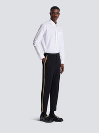 Embroidered crepe tailored trousers - Waistband with belt loops and a triple belt loop at the back - Zip and hook fastening under a placket - 2 Italian side pockets - Pleats on the front and back - Side embroidery with golden beads and crystals - 2 slash pockets with buttons on the back - Straight cut - Model measures 190cm and wears a size 48 - Main material: 100% viscose - Made in India - Item: FH1PM090PD09100% of the viscose fibres used to make this garment come from certified, sustainably managed forests