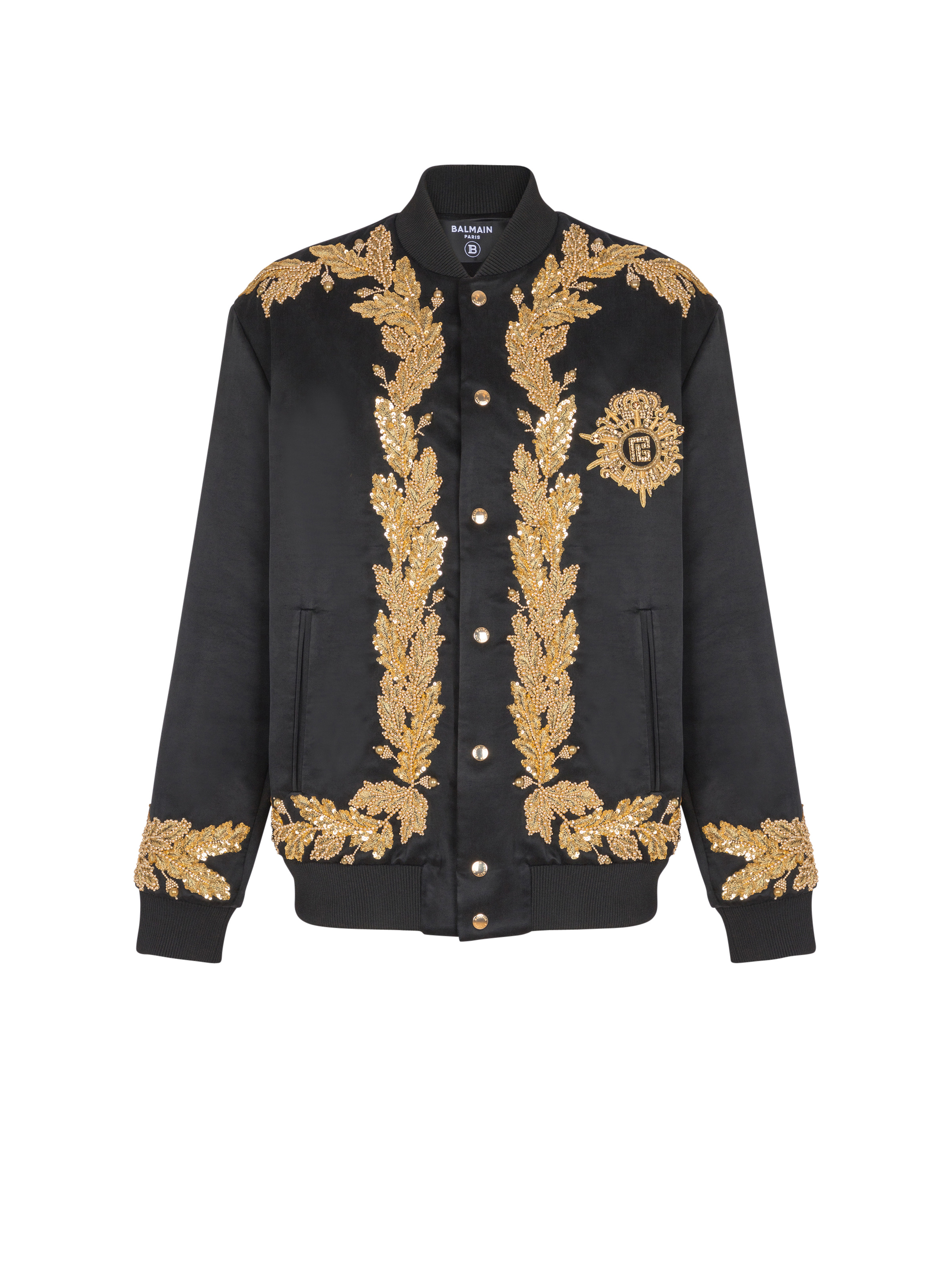 Embroidered cupro bomber jacket - Balmain Ecusson embroidery on the chest - Embroidered trim - Long sleeves - Embroidered cuffs - Golden cannetille, crystal, bead and sequin embroidery - 2 slash side pockets - Front fastening with 7 Balmain-engraved golden press studs - Ribbed trim - Inside slash pocket - Satin lining - Classic fit - Model measures 190cm and wears a size 48 - Main material: 100% cupro - Made in India - Item: FH1TFA75PD09