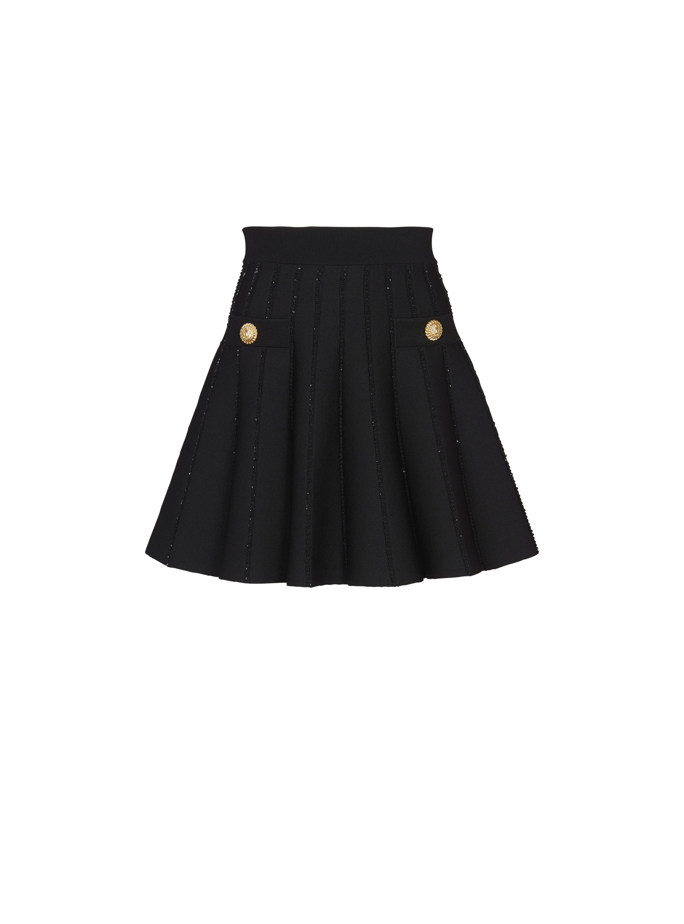 Flared knit skirt with sparkly stripes - Ribbed waist - 2 fake front pockets with buttons - "Double Chain Lion" buttons in gold metal - Visible gold metal zip fastening on the back with Balmain-engraved slider - Short high-waisted fit - Model measures 179cm and wears a size 36 - Main material: 100% viscose - Made in Italy - Item: EF1LB929KI15100% of the viscose fibres used to make this garment are recycled and certified
