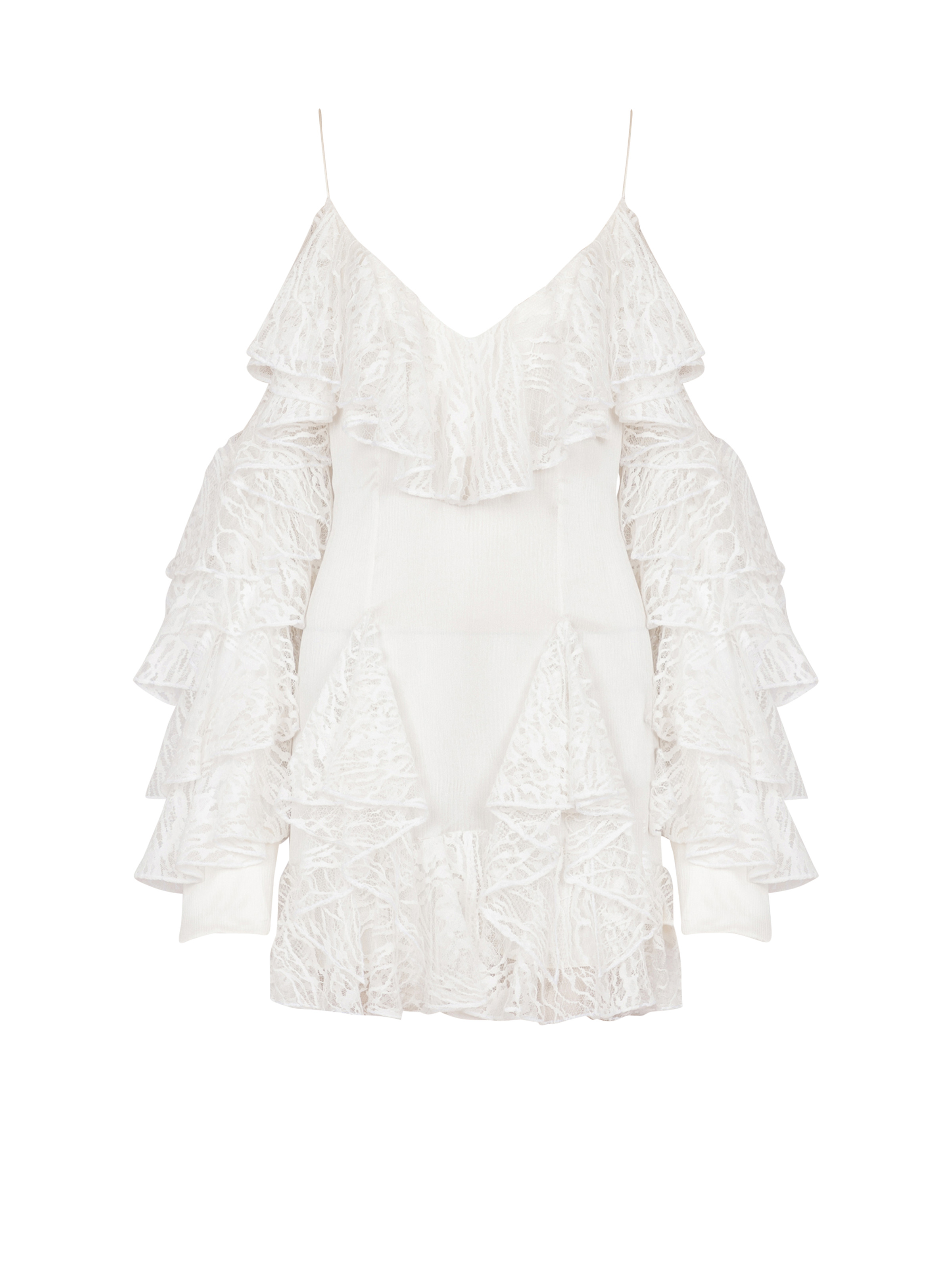 Flowing satin dress with lace ruffles - Thin straps - V-neckline - Sleeveless - Long sleeves - Straight cuffs with 4 satin-covered buttons - Back fastening with invisible zip and hook - Cropped cut with fitted waist - Model measures 179cm and wears a size 36 - Main material: 100% silk - Made in France - Item: FF1R2450MH29
