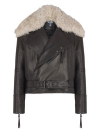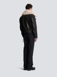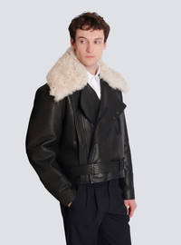 Leather biker jacket - Removable shearling over-collar - Long sleeves with a zip - Asymmetric invisible zip fastening with press studs and a Balmain Paris-engraved slider - Zipped side pockets - Belt loops at the waist with removable belt - Straight cut - Gusset-style panels in the side with press studs- Model measures 189cm and wears a size 48 - Main material: 100% lambskin - Made in Turkey - Item: GH1TD575LE31