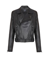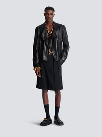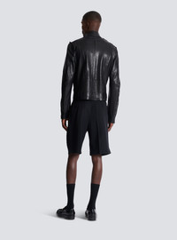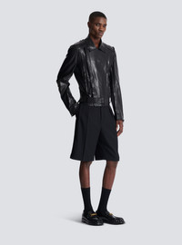 Lightweight lambskin leather biker jacket - Shirt collar with press stud buttons - Long sleeves with visible zips on the cuffs - Asymmetrical fastening with a visible zip and press studs - Detachable belt with double loop - 2 side pockets with visible zip - Raw hems - Matching hardware - Balmain-engraved press studs and sliders - Straight cut - Model measures 190cm and wears a size 48 - Main material: 100% lambskin - Made in Turkey - Item: FH1TD625LD63