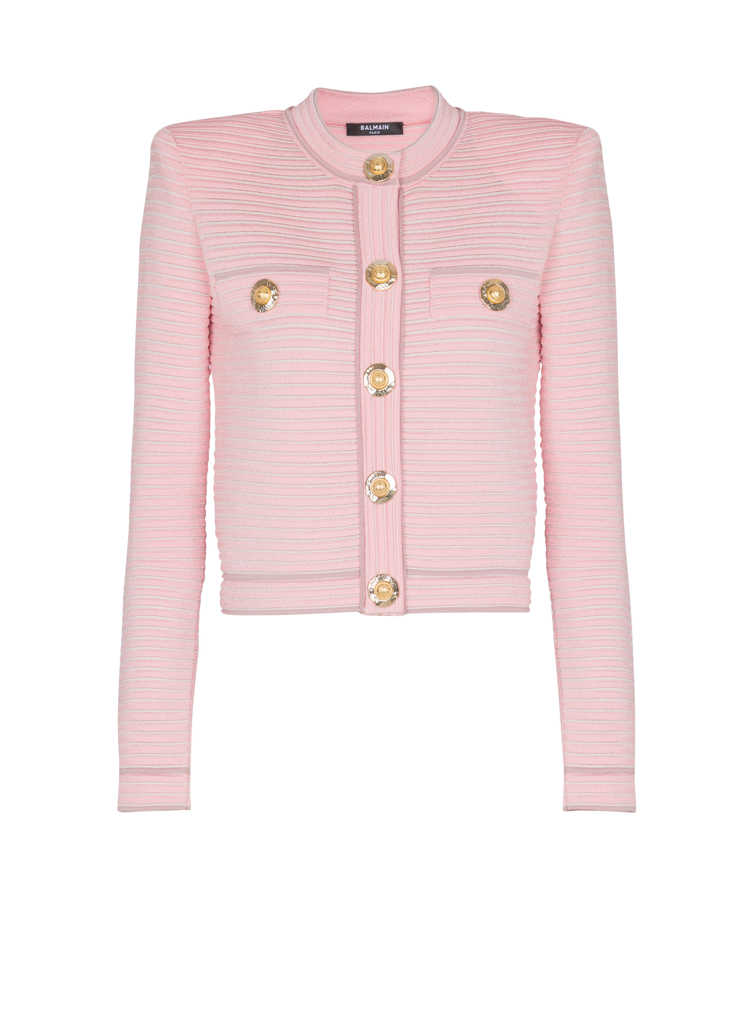 Textured knit cardigan - Round neckline - Structured shoulders - Long sleeves - Front fastening with 5 press studs - 2 trompe-l'œil pockets with 2 decorative buttons - Metal “Gold and Gold Coin” buttons - Piped trim - Straight cut - Model measures 178cm and wears a size 36 - Main material: 82% viscose 15% polyester 3% polyamide - Made in Italy - Item: FF1KL240KI83