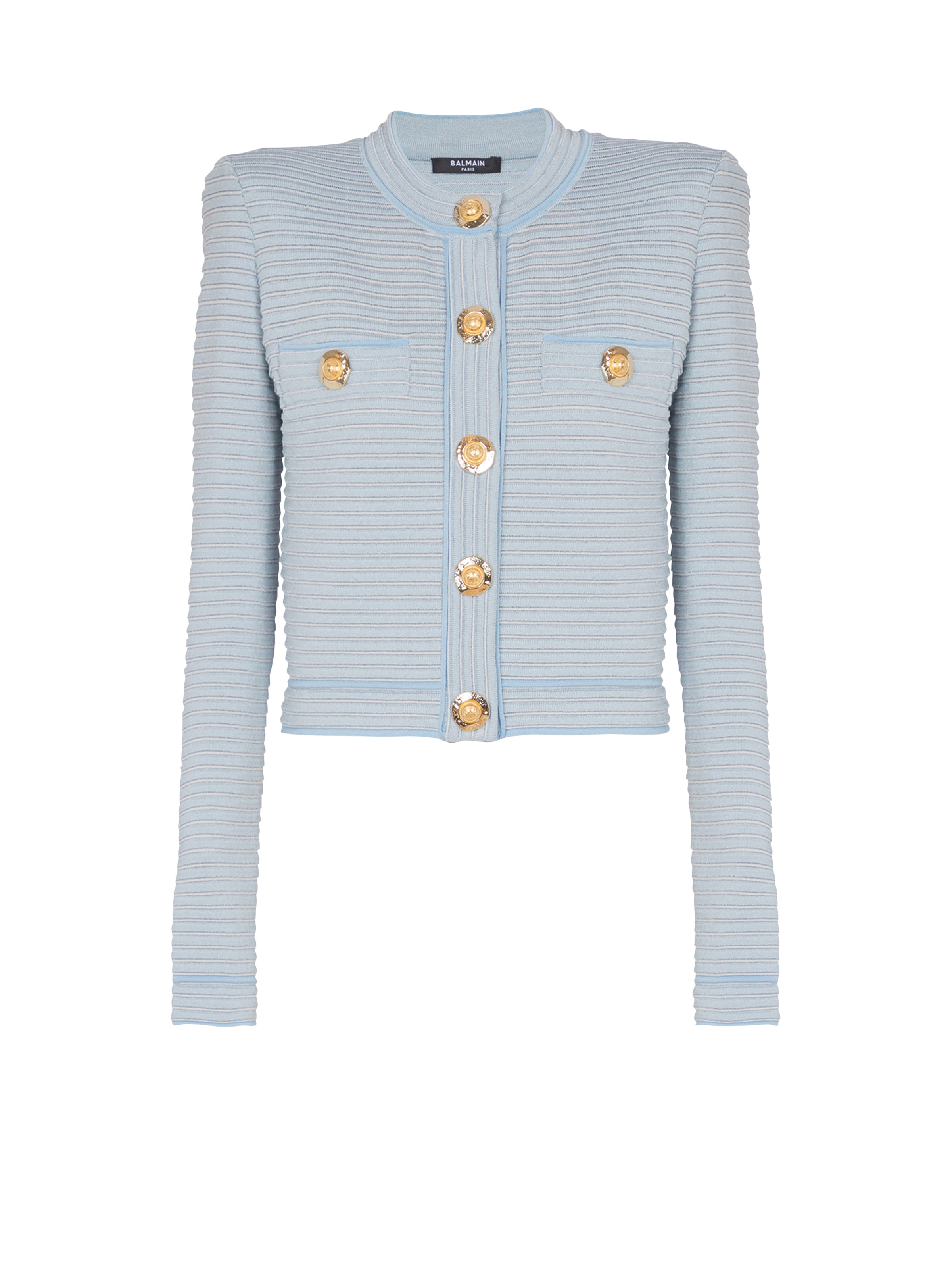 Textured knit cardigan - Round neckline - Structured shoulders - Long sleeves - Front fastening with 5 press studs - 2 trompe-l'œil pockets with 2 decorative buttons - Metal “Gold and Gold Coin” buttons - Piped trim - Straight cut - Model measures 178cm and wears a size 36 - Main material: 82% viscose 15% polyester 3% polyamide - Made in Italy - Item: FF1KL240KI83