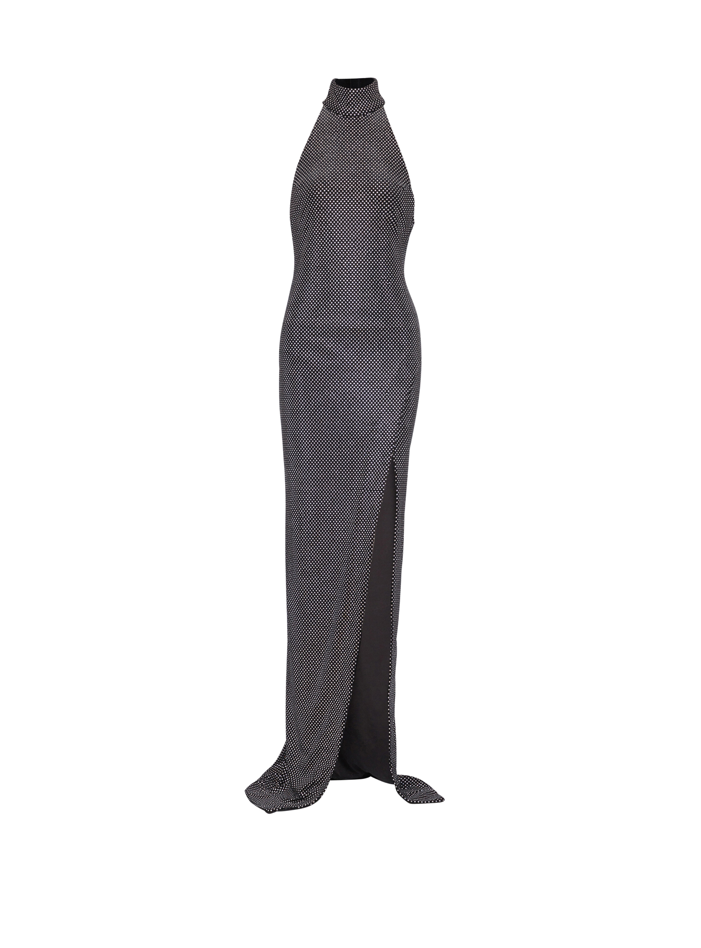 Long velvet halterneck dress with rhinestones - High neck - Neck fastening with hooks - Side fastening with invisible zip and hook - Front split - Jersey lining - Long, slim fit - Model measures 179cm and wears a size 36 - Main material: 94% polyester % elastane - Made in Bulgaria - Item: FF1RP149JK66