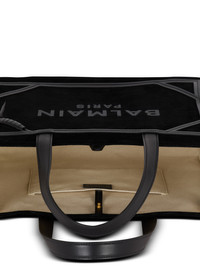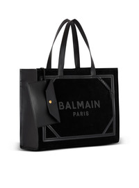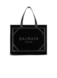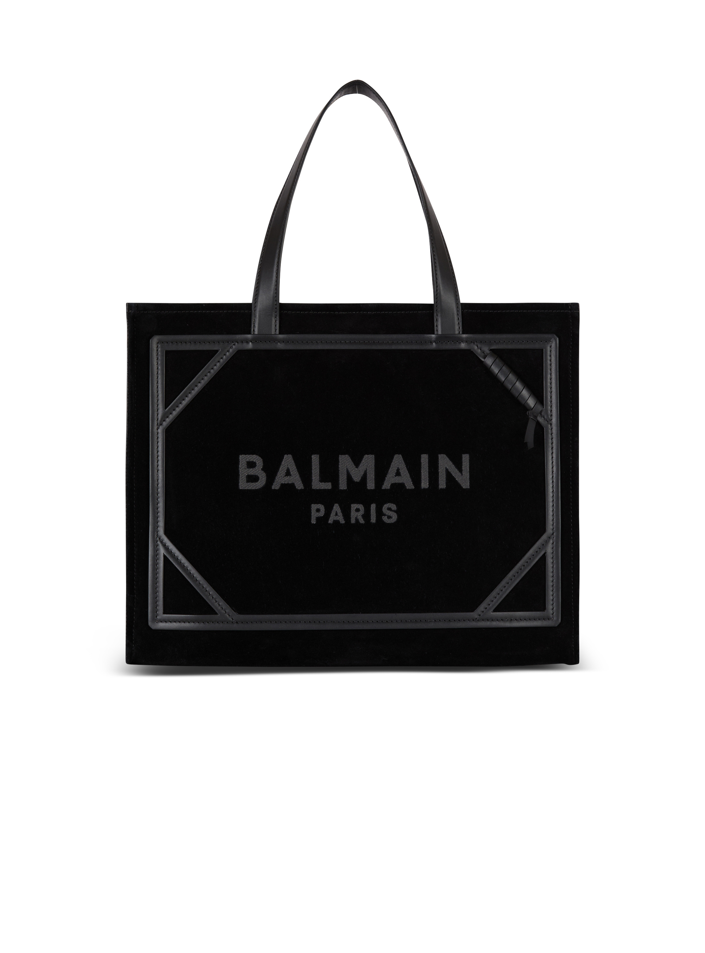 Medium suede B-Army tote bag - Carry in the hand or wear on the shoulder - Embroidered Balmain Paris logo - Topstitched smooth leather details - Smooth leather side gussets - Smooth leather handles - Leather fastening with stud buttons - Inside canvas pocket, Balmain logo in embossed leather - Detachable leather pouch with embossed Balmain logo and press-stud fastening - Reinforced bottom - Leather bag feet - Gold hardware - Dimensions: 42 x 34 x 13 cm - Main material: 100% calfskin - Made in Italy - Item: EN1FF901LDCY