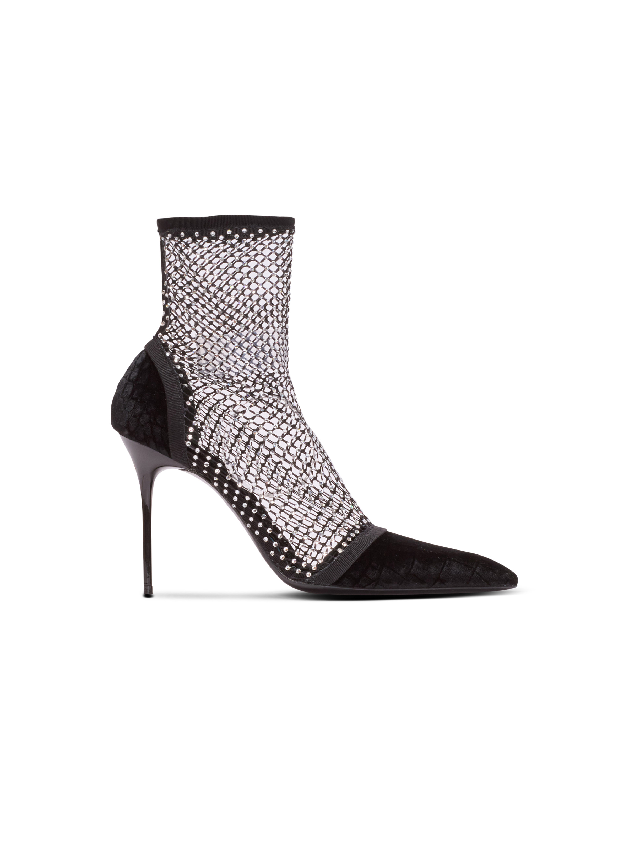 Mesh heeled ankle boots with crocodile-embossed velvet and rhinestones - Velvet heel counter and pointed toe - Mesh shaft with rhinestones - Grosgrain ribbon finish - Lacquered stiletto heel - Golden PB logo print on the back - Leather outsole - Velvet insole - Heel height: 9.5 cm - Main material: 93% polyester 7% spandex - Made in Italy - Item: FN1TE145TCYS