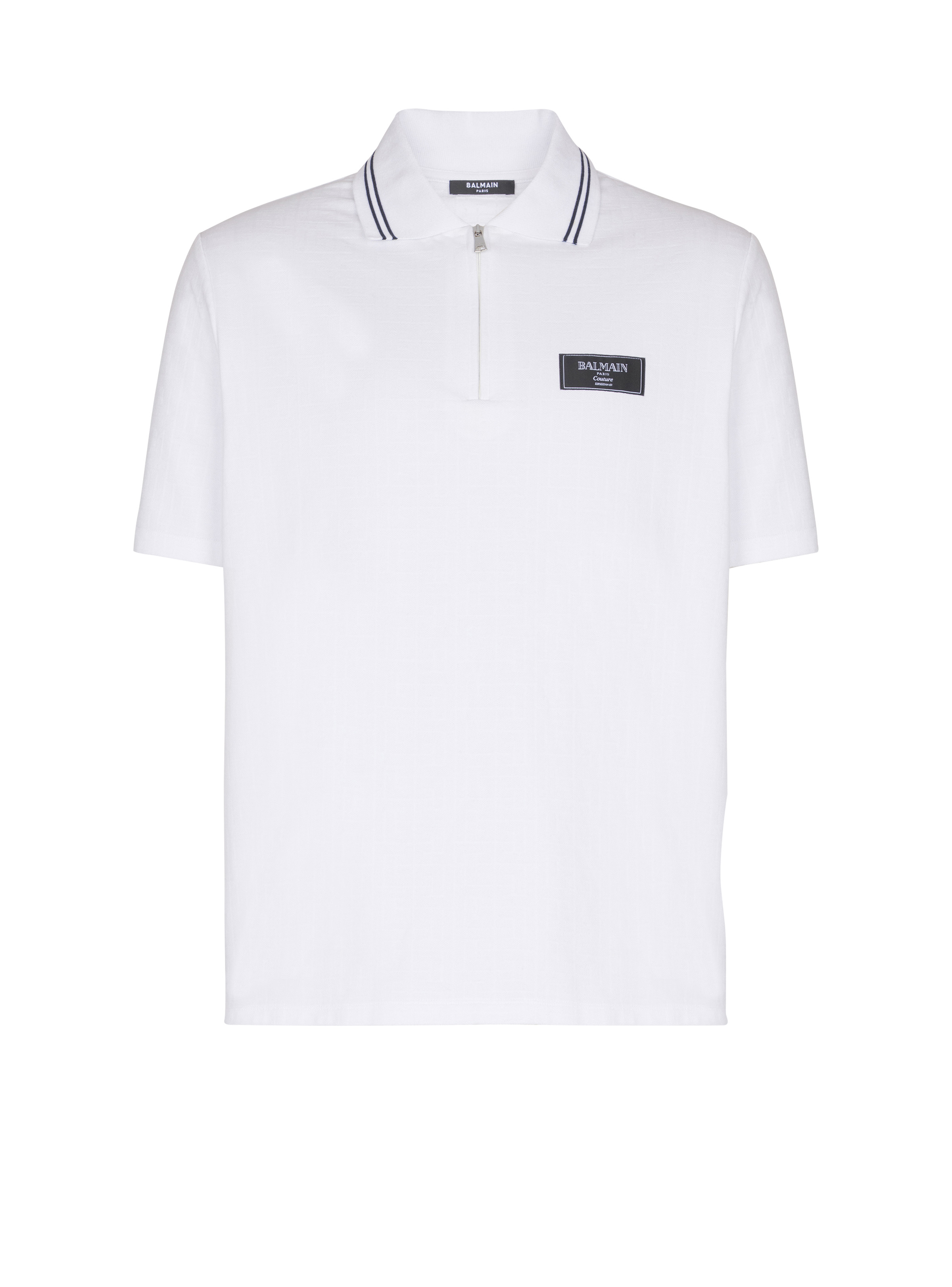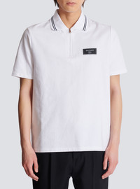PB Labyrinthe-monogrammed knit polo shirt with Balmain Couture label - Polo collar with contrasting stripes - Zip fastening with Balmain Paris-engraved slider - Short sleeves - Balmain Couture label embroidered on the chest - Straight cut - Model measures 190cm and wears a size M - Main material: 97% cotton 3% elastane - Made in Italy - Item: EH2GC027JB82