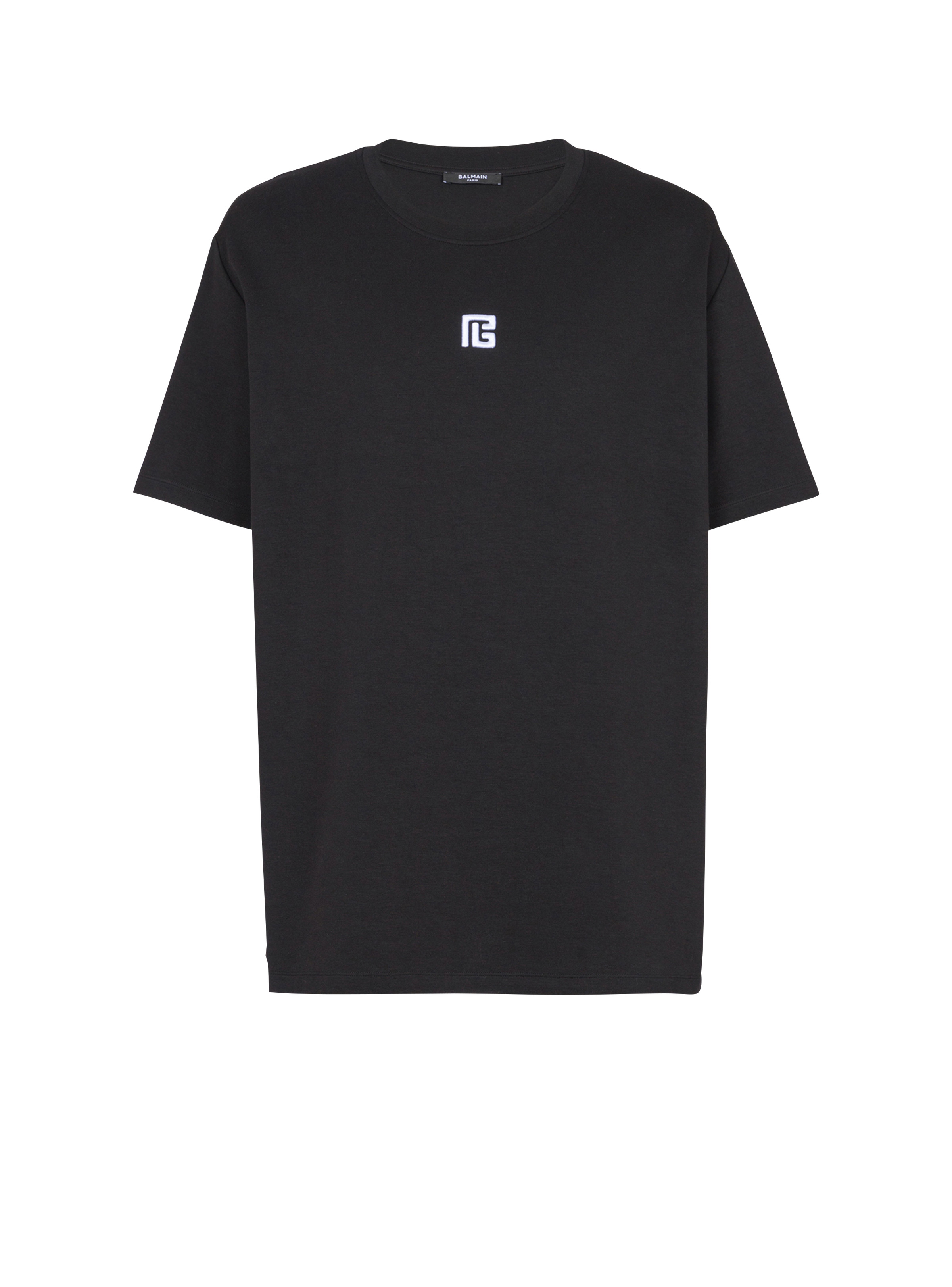 PB embroidered T-shirt - Round neck with ribbed trim - Short sleeves - Small contrasting PB logo embroidered on the front - Regular fit - Model measures 187cm and wears a size M - Main material: 39% modal 39% cotton 12% elastane 10% polyamide - Made in Portugal - Item: EH1EG010BC87100% of the cotton fibres used to make this garment are certified and organically farmed