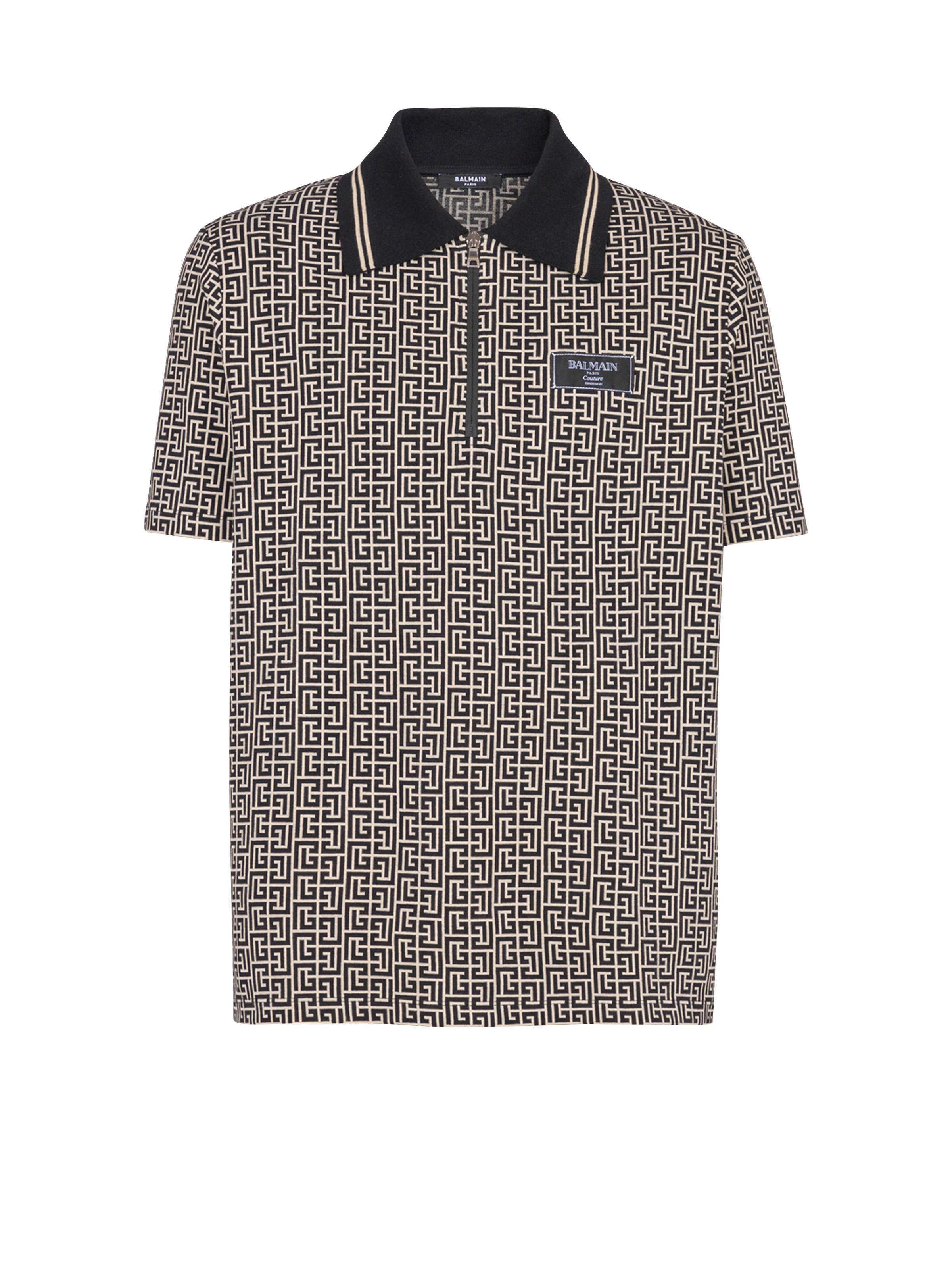 PB Labyrinth jacquard polo shirt - Contrasting polo collar with stripes - Zip fastening, engraved silver metal slider - Short sleeves - Woven Balmain Couture label on the chest - Straight cut - Model measures 187cm and wears a size M - Main material: 95% cotton 5% elastane - Made in Portugal - Item: EH1GC027BC90100% of the cotton fibres used to make this garment are certified and organically farmed