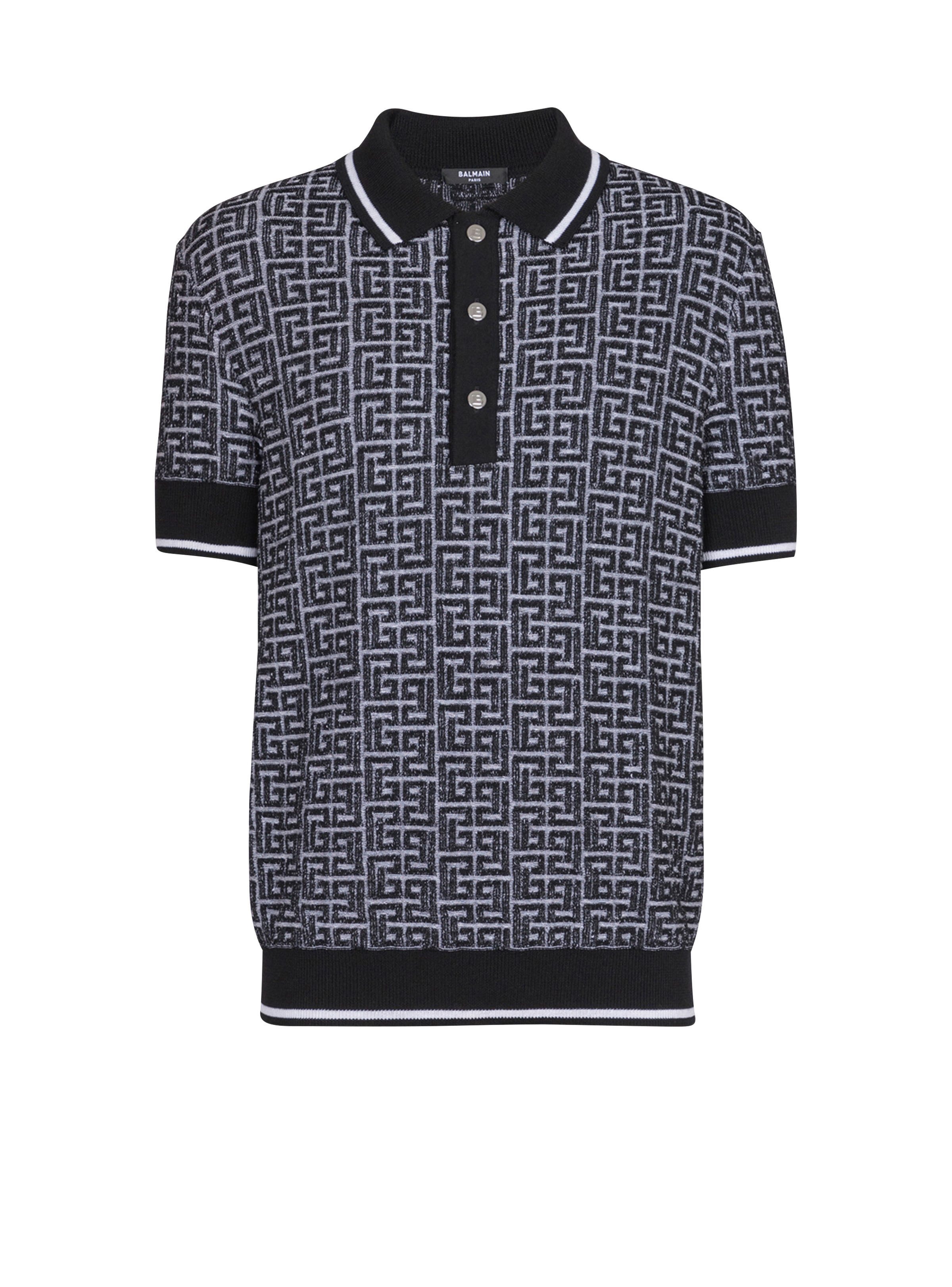 PB Labyrinth knit polo shirt - Polo collar - Fastening with 3 silver metal B-engraved buttons - Short sleeves - Striped ribbed edging - Relaxed fit - Model measures 187cm and wears a size M - Main material: 66% merino wool 36% linen 4% polyamide - Made in France - Item: EH1GB020KI03