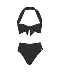 Plain two-piece swimsuit - Bow on the front - Gathered straps - Halterneck fastening with 2 “Chain Lion” press studs - Side gathers - Panels on the sides - Balmain Paris-engraved hook fastening at the back - Gathered high-waisted bottoms - Metal PB plaque on the side - Gold hardware - Lined - Model measures 179cm and wears a size 36 - Main material: 85% polyamide 15% elastane - Made in Italy - Item: BKBBT2440