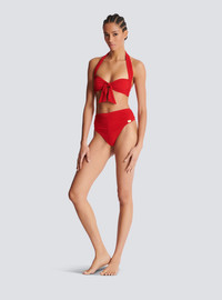 Plain two-piece swimsuit - Bow on the front - Gathered straps - Halterneck fastening with 2 “Chain Lion” press studs - Side gathers - Panels on the sides - Balmain Paris-engraved hook fastening at the back - Gathered high-waisted bottoms - Metal PB plaque on the side - Gold hardware - Lined - Model measures 179cm and wears a size 36 - Main material: 85% polyamide 15% elastane - Made in Italy - Item: BKBBT2440