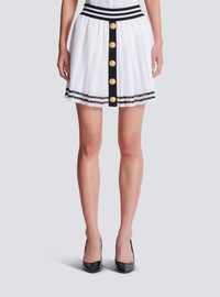 Knit pleated two-tone skirt with PB Labyrinthe monogram - Ribbed waistband with stripes - 5 decorative "Coin" buttons in gold metal - Visible gold metal zip fastening on the back with Balmain Paris-engraved slider - Knit slip - Short, flared cut - Model measures 179cm and wears a size 36 - Main material: 69% viscose 31% polyamide - Made in France - Item: EF2LB216KI89100% of the viscose fibres used to make this garment come from certified, sustainably managed forests