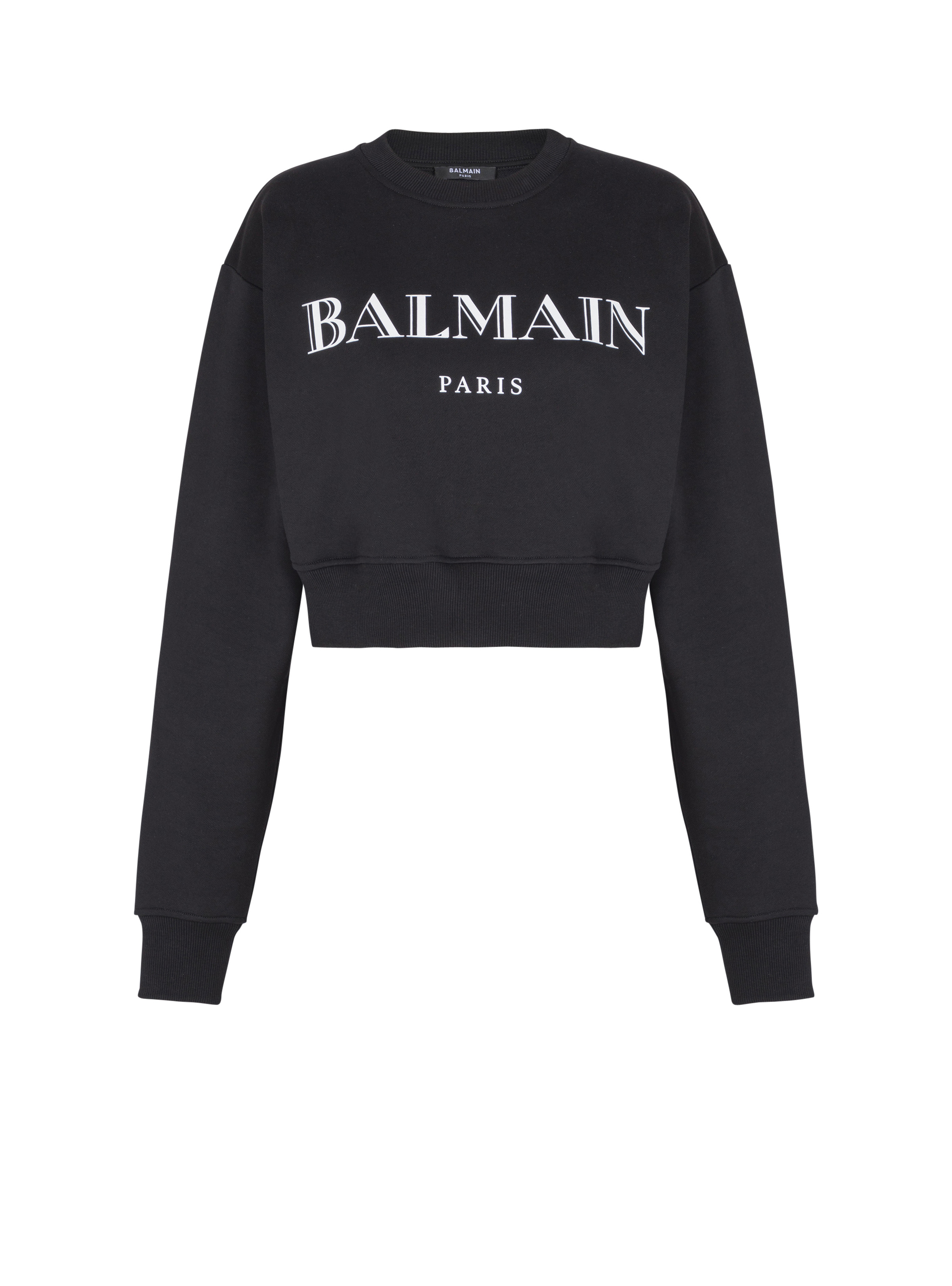 Printed Balmain sweatshirt - Vintage Balmain logo printed on the front - Cropped, relaxed fit - Crew neck - Long sleeves - Ribbed trim - Model measures 178cm and wears a size S - Main material: 100% cotton - Made in Portugal - Item: FF2JO080BD28