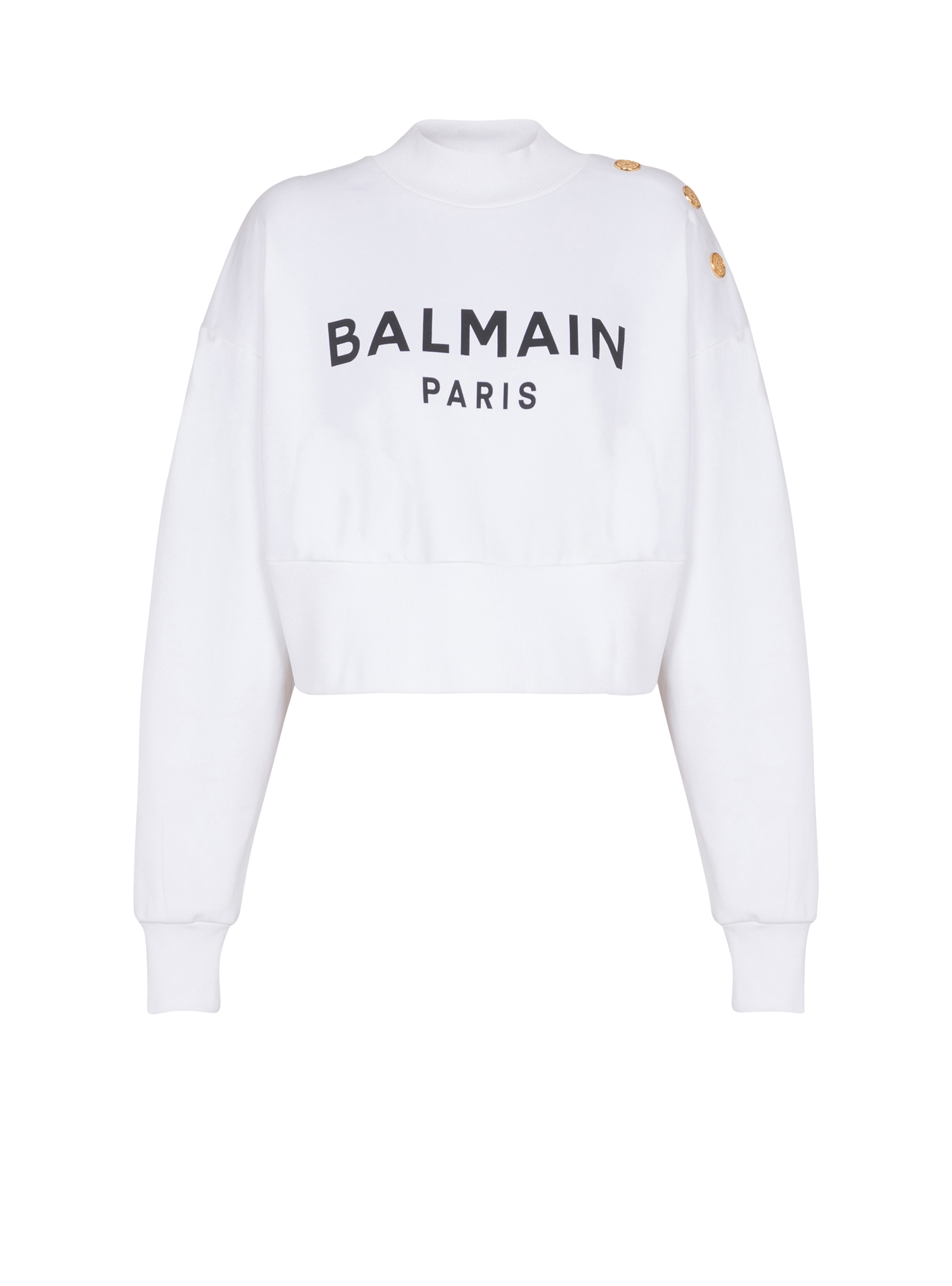 Printed Balmain Paris sweatshirt - Round neckline - 3 decorative embossed gold metal buttons on the shoulder - Long sleeves - Contrasting Balmain Paris logo printed on the front - Ribbed trim - Regular cropped cut - Model measures 179cm and wears a size S - Main material: 100% cotton - Made in Portugal - Item: EF1JQ002BB02100% of the cotton fibres used to make this garment are certified and organically farmed