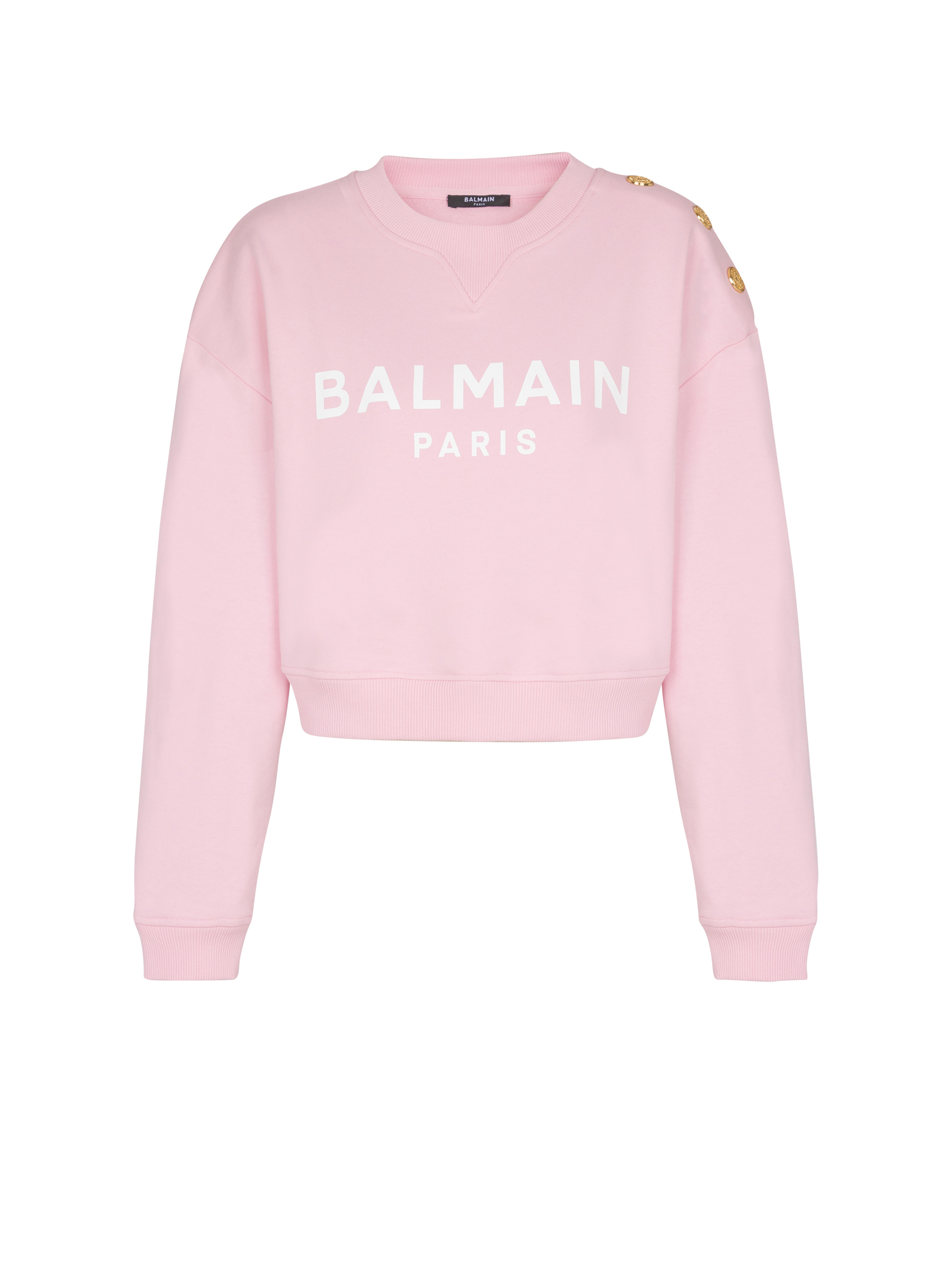 Printed Balmain Paris sweatshirt - Round neckline - 3 decorative embossed gold metal buttons on the shoulder - Long sleeves - Contrasting Balmain Paris logo printed on the front - Ribbed trim - Regular cropped cut - Model measures 179cm and wears a size S - Main material: 100% cotton - Made in Portugal - Item: EF1JQ002BB02100% of the cotton fibres used to make this garment are certified and organically farmed