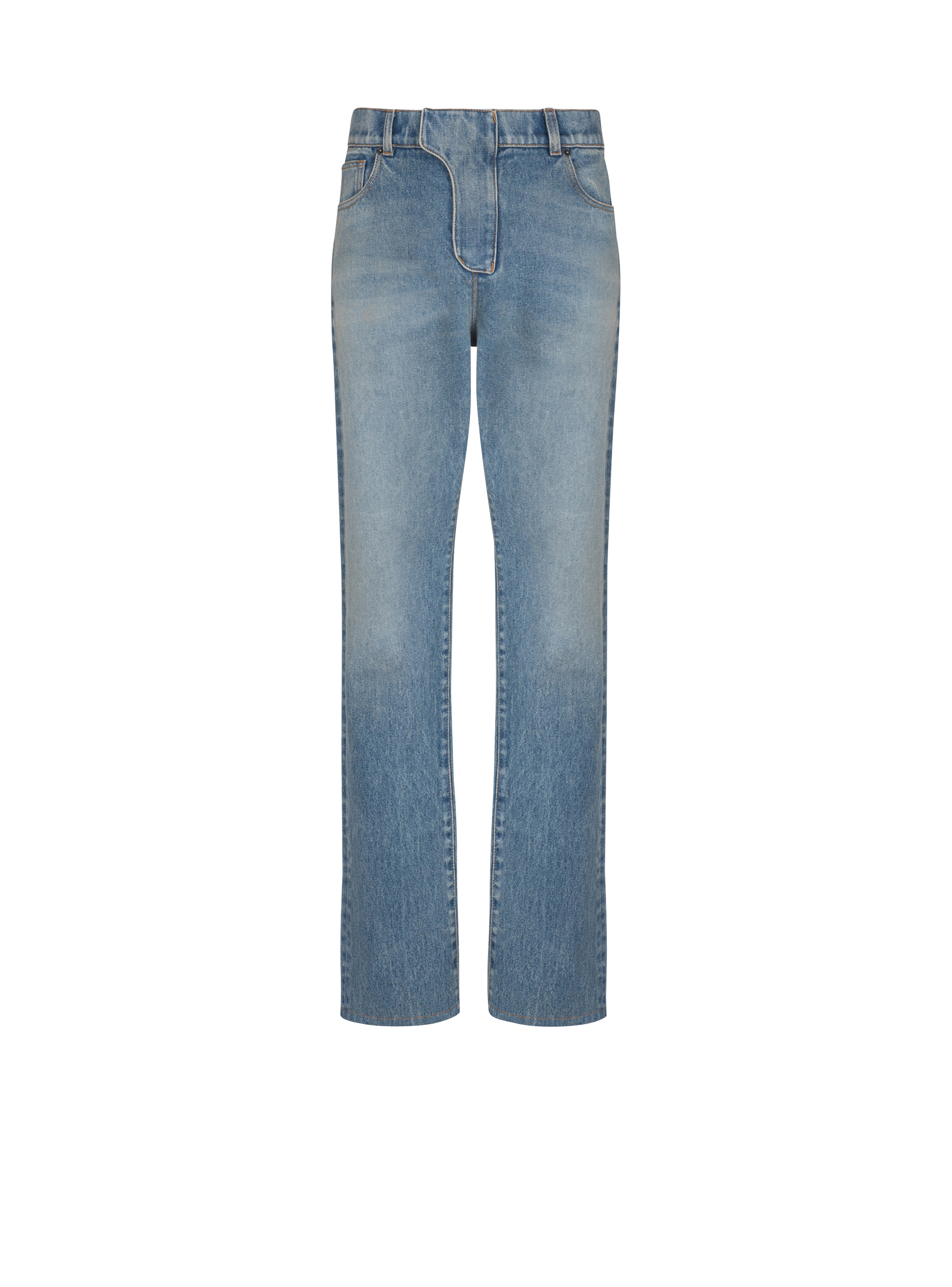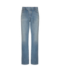 Regular-fit blue denim jeans - Waistband with belt loops and a triple belt loop at the back - Fly - Zip and press-stud fastening under a placket - 5 classic pockets - Woven vintage Balmain label - Engraved rivets - Silver hardware - Regular fit - Model measures 188cm and wears a size 30 - Main material: 100% cotton - Made in Italy - Item: EH0MI083DF44