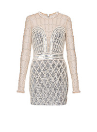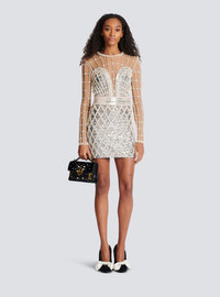 Short dress in embellished tulle - Pearl beads, crystals and silver sequins - Tight fit - Round neck, trompe l'oeil bustier - Long sleeves with invisible-zipped cuffs - Silver metal zip fastening at the back - Model measures 175cm and wears a size 36 - Material: 97% polyamide, 3% elastane - Made in France - Item: BF0R9338PC03
