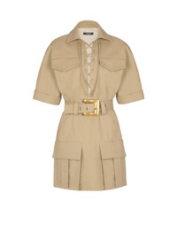 Plain short cotton gabardine lace-up dress - Shirt collar - Adjustable lace-up front - Long sleeves - 2 flap breast pockets - Detachable belt with golden metal Anthem buckle and loops - 2 side bellows pockets with flap - Cropped cut with fitted waist - Model measures 179cm and wears a size 36 - Main material: 100% cotton - Made in Bulgaria - Item: FF1R7415CF69 100% of the cotton fibres used to make this garment are certified and organically farmed