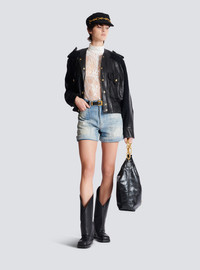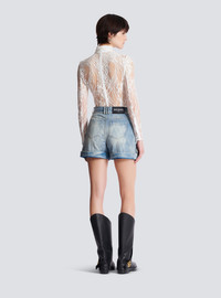 Blue topstitched denim shorts with Diamond pattern - Waistband with belt loops and a triple belt loop at the back - “Gold and Silver Coin” metal button fastening with zip and fly - 2 curved pockets on the front - 2 patch pockets on the back - Woven Balmain Vintage label on the back - Cuffed hems - Engraved rivets - Gold hardware - Short high-waisted fit - Model measures 178cm and wears a size 36 - Main material: 100% cotton - Made in Italy - Item: FF1MA155DF79