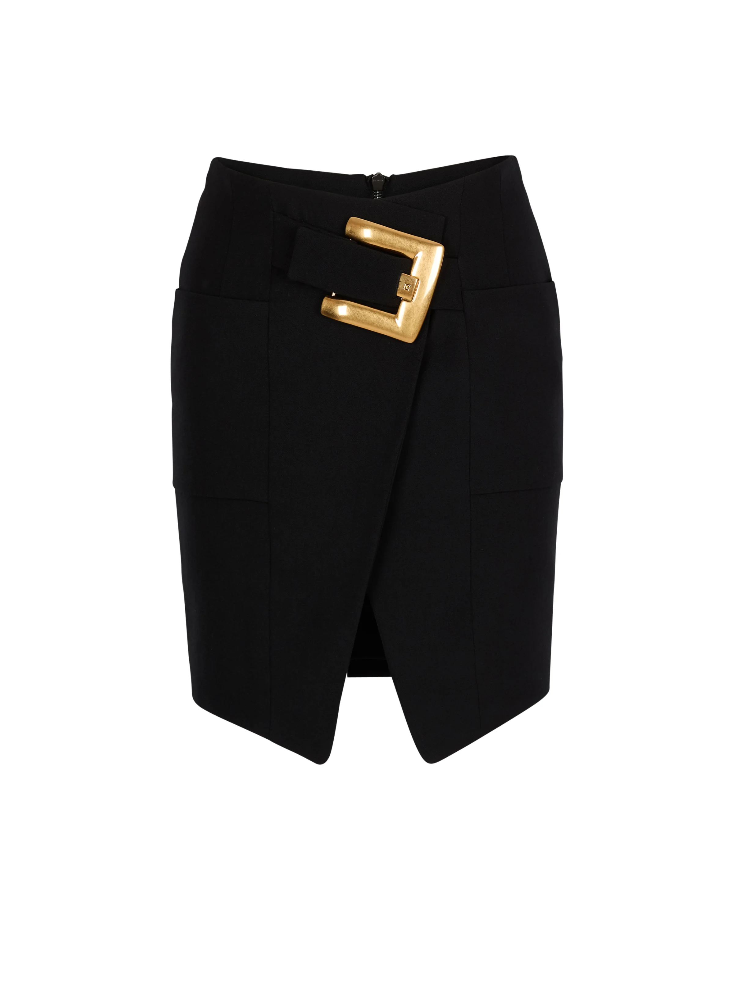 Short grain de poudre skirt with slit - Integrated belt with Anthem buckle - Patch pockets at the sides - Straight cut - Model measures 177cm and wears a size 36 - Main material: 100% virgin wool - Made in Poland - Item: GF1LBB22WC09100% of the wool fibres used to make this garment are sourced from sheep farms that are certified and animal welfare-friendly