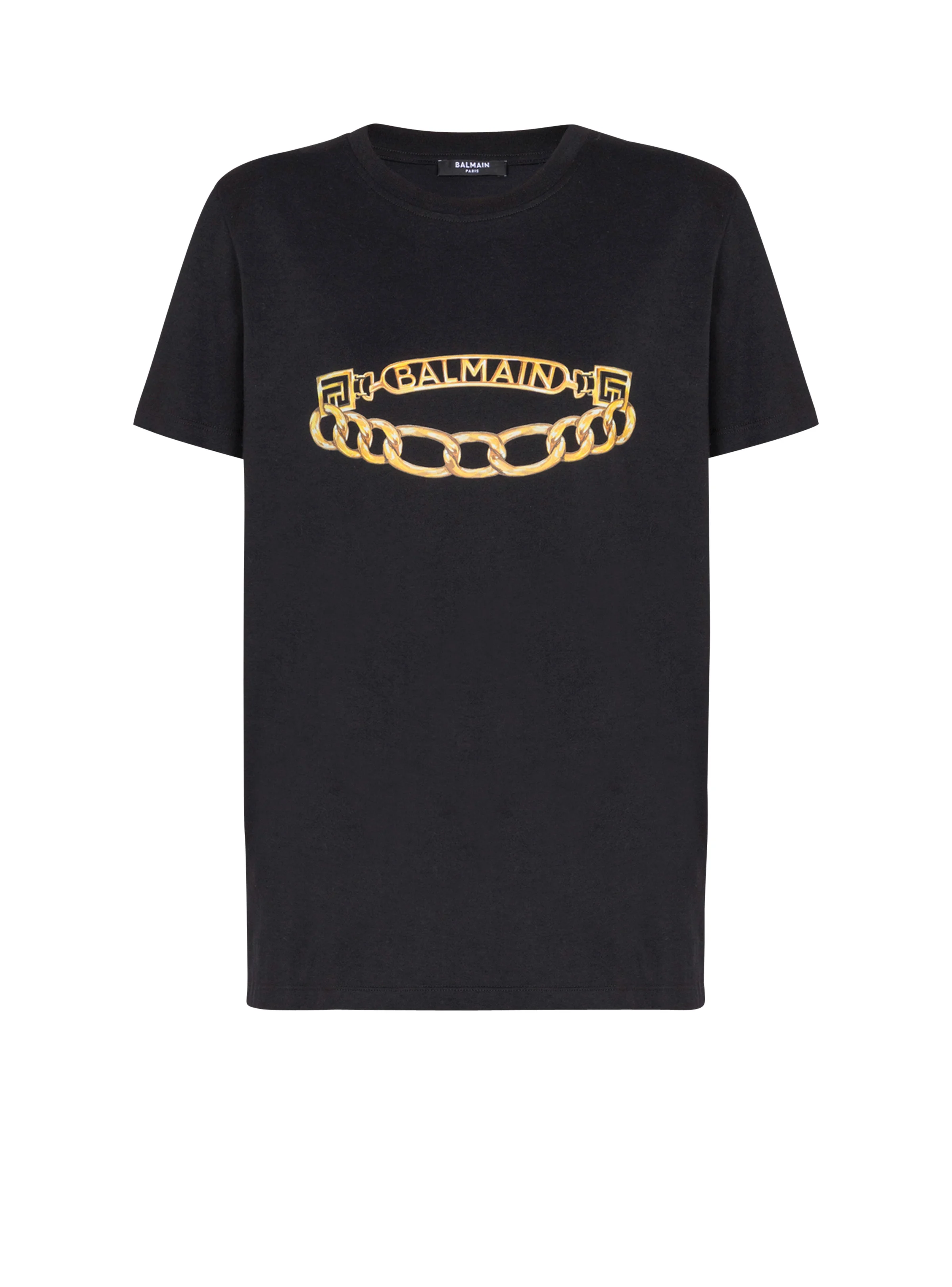 Printed Balmain Chain logo T-shirt - Round neck with ribbed trim - Short sleeves - Balmain Chain logo printed on the front - Regular fit - Model measures 178cm and wears a size S - Main material: 100% cotton - Made in Portugal - Item: FF1EF004GE97100% of the cotton fibres used to make this garment are certified and organically farmed
