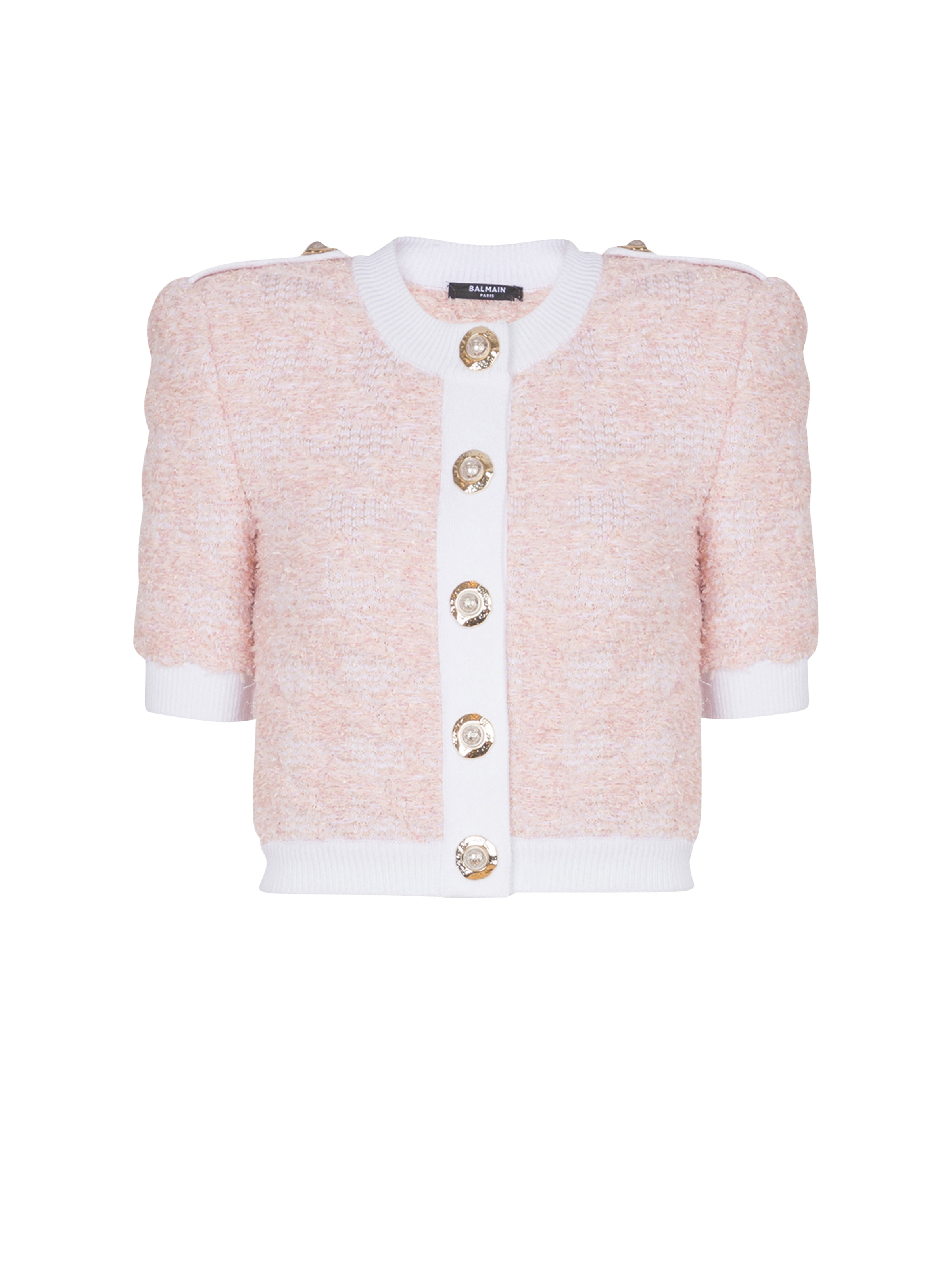 Houndstooth tweed-effect knit cardigan - Round neckline - Shoulder tabs with decorative buttons - Structured shoulders - Short sleeves - Front fastening with 5 press studs - Metal “Gold and Silver Coin” buttons - Shiny textured tweed-effect knit - Ribbed trim - Cropped slim fit - Model measures 178cm and wears a size 36 - Main material: 66% polyester 16% viscose 13% cotton 3% polyester 2% metallic polyester - Made in France - Item: FF1KL235KI72