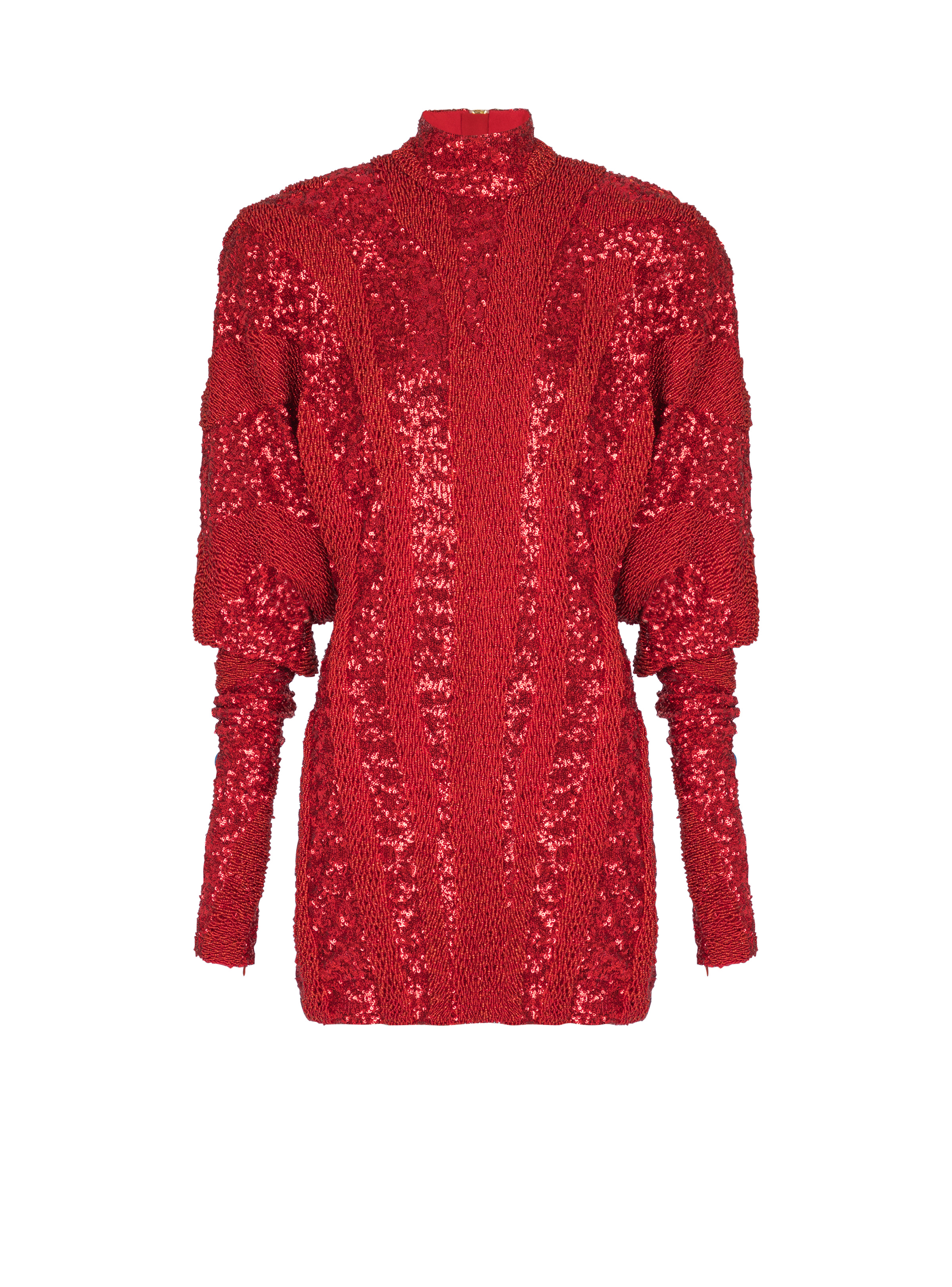Short dress with an embellished zebra print in sequins and beads - High neck - Shoulder pads - Long batwing sleeves with invisible zips on the cuffs - Zip fastening on the back with Balmain Paris-engraved slider - Lined - Fitted cut - Model measures 178cm and wears a size 36 - Main material: 95% polyamide 5% elastane - Made in India - Item: FF0R9377PD22