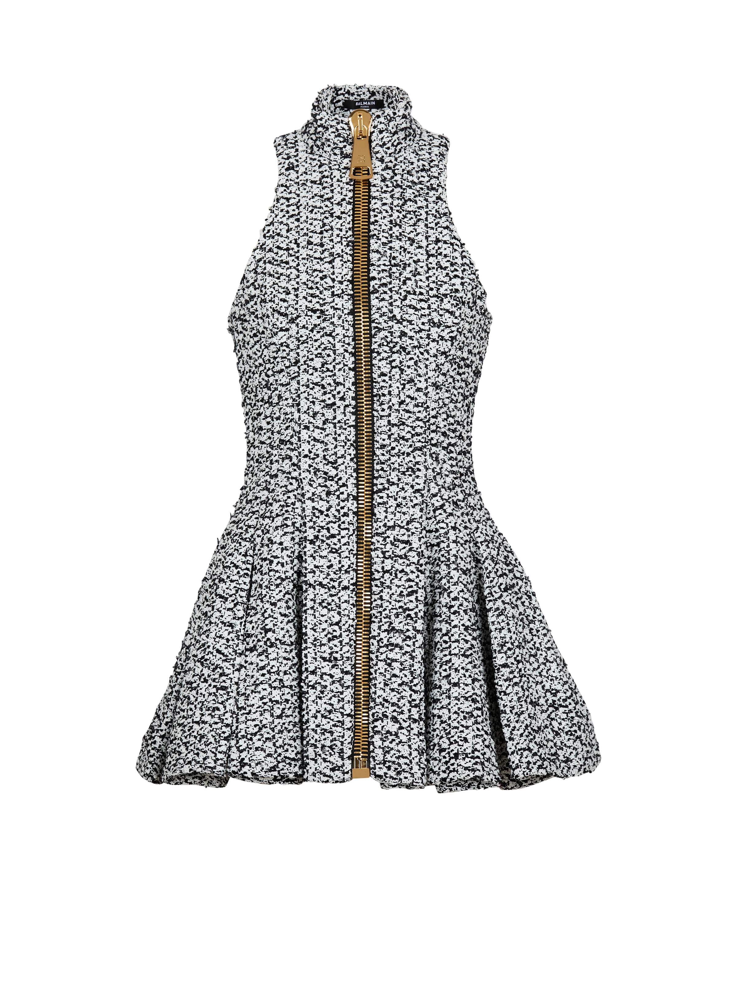 Sleeveless flared tweed dress - High neck - Cutaway shoulders - Visible full-length zip with oversized engraved slider - Flared skirt - Fitted bodice - Model measures 180cm and wears a size 36 - Main material: 93% polyamide 7% viscose - Made in Poland- Item: FF0R5158XL35
