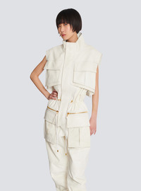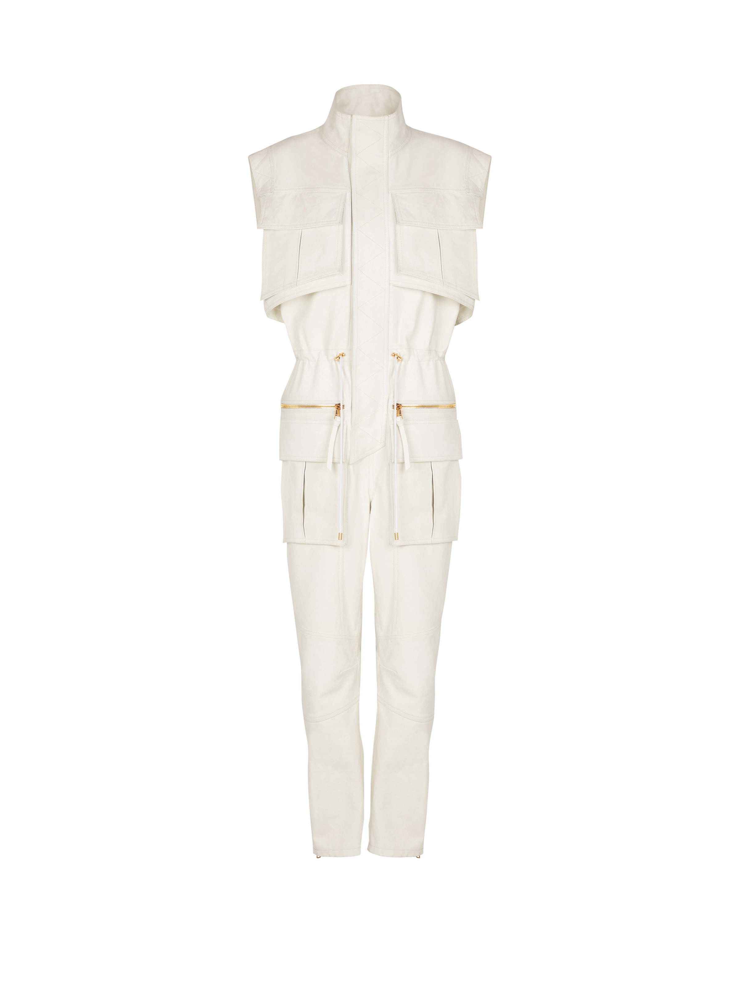 Sleeveless lambskin jumpsuit - Wide high collar - Multiple patch and zip pockets - Adjustable waist with elasticated cord and cord lock - Knee panels and topstitched details - Straight relaxed fit - Model measures 178cm and wears a size 36 - Main material: 100% lambskin - Made in Turkey - Item: FF0QO025LE04