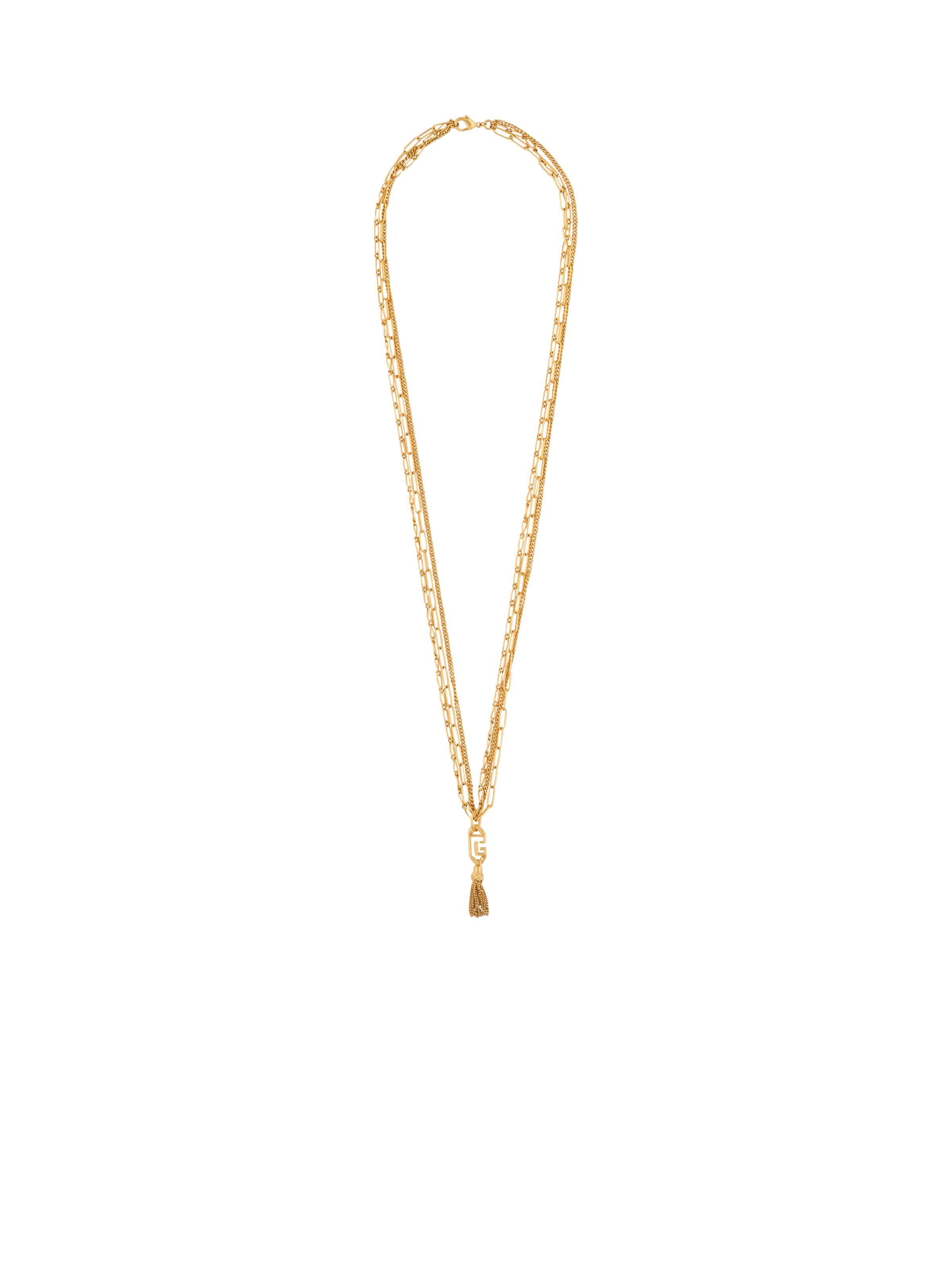 Sync golden brass long necklace - 3 chains with different links - Link-shaped pendant with PB logo - Fine chain tassels - Spring clasp - Main material: 100% brass - Made in Thailand - Item: FM1XA104MBRA