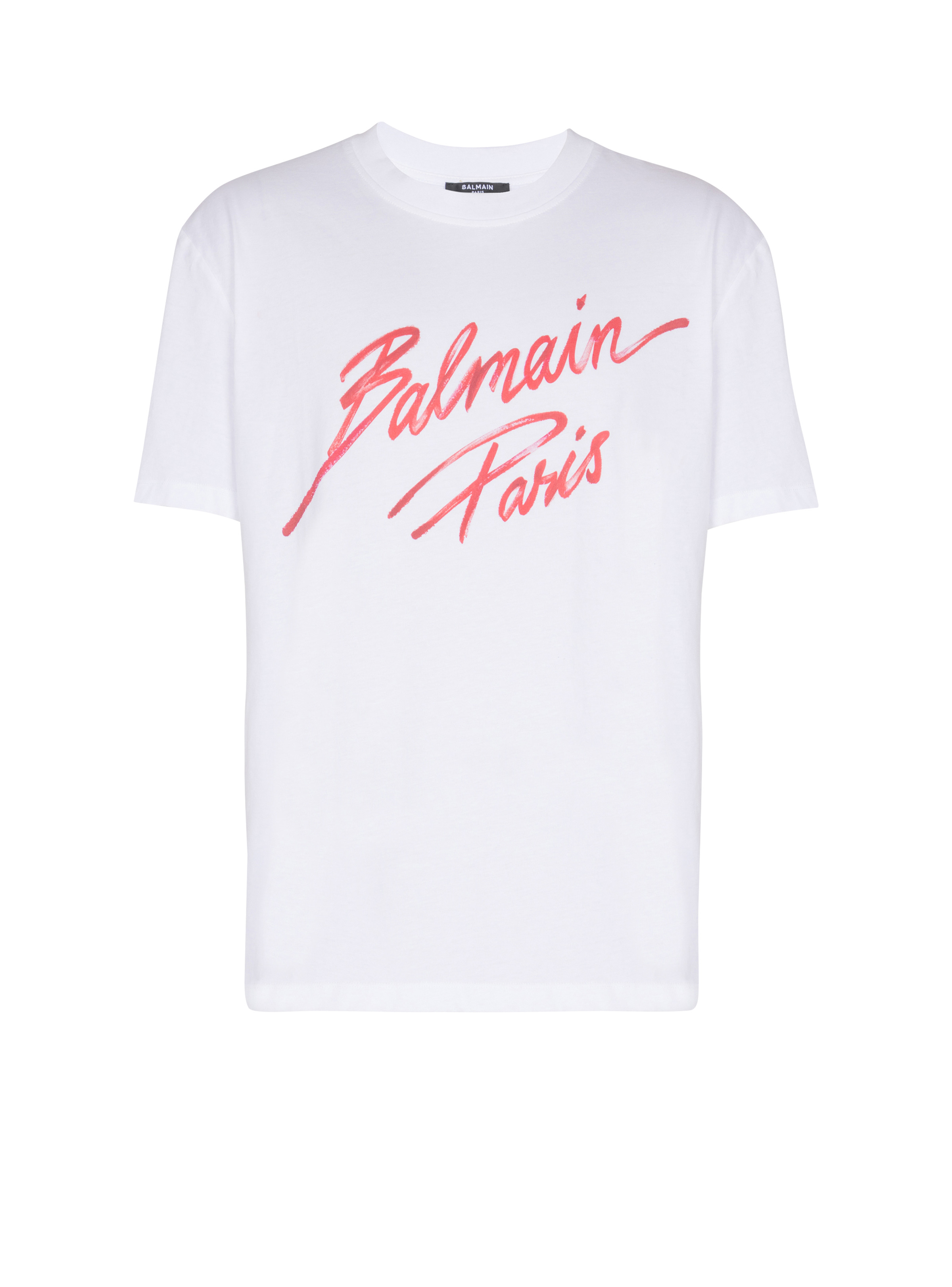 T-shirt with Balmain Lipstick print - Round neck with ribbed trim - Short sleeves - Contrasting Balmain Lipstick logo printed on the front - Regular fit - Model measures 190cm and wears a size M - Main material: 100% cotton - Made in Portugal - Item: EH2EG000BD11100% of the cotton fibres used to make this garment are certified and organically farmed