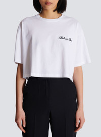T-shirt with Balmain Signature embroidery - Cropped, relaxed fit - Round neck with ribbed trim - Short sleeves - Contrasting Balmain Signature logo embroidered on the front - Model measures 178cm and wears a size S - Main material: 100% cotton - Made in Portugal - Item: DF1EE020BC78100% of the cotton fibres used to make this garment are certified and organically farmed
