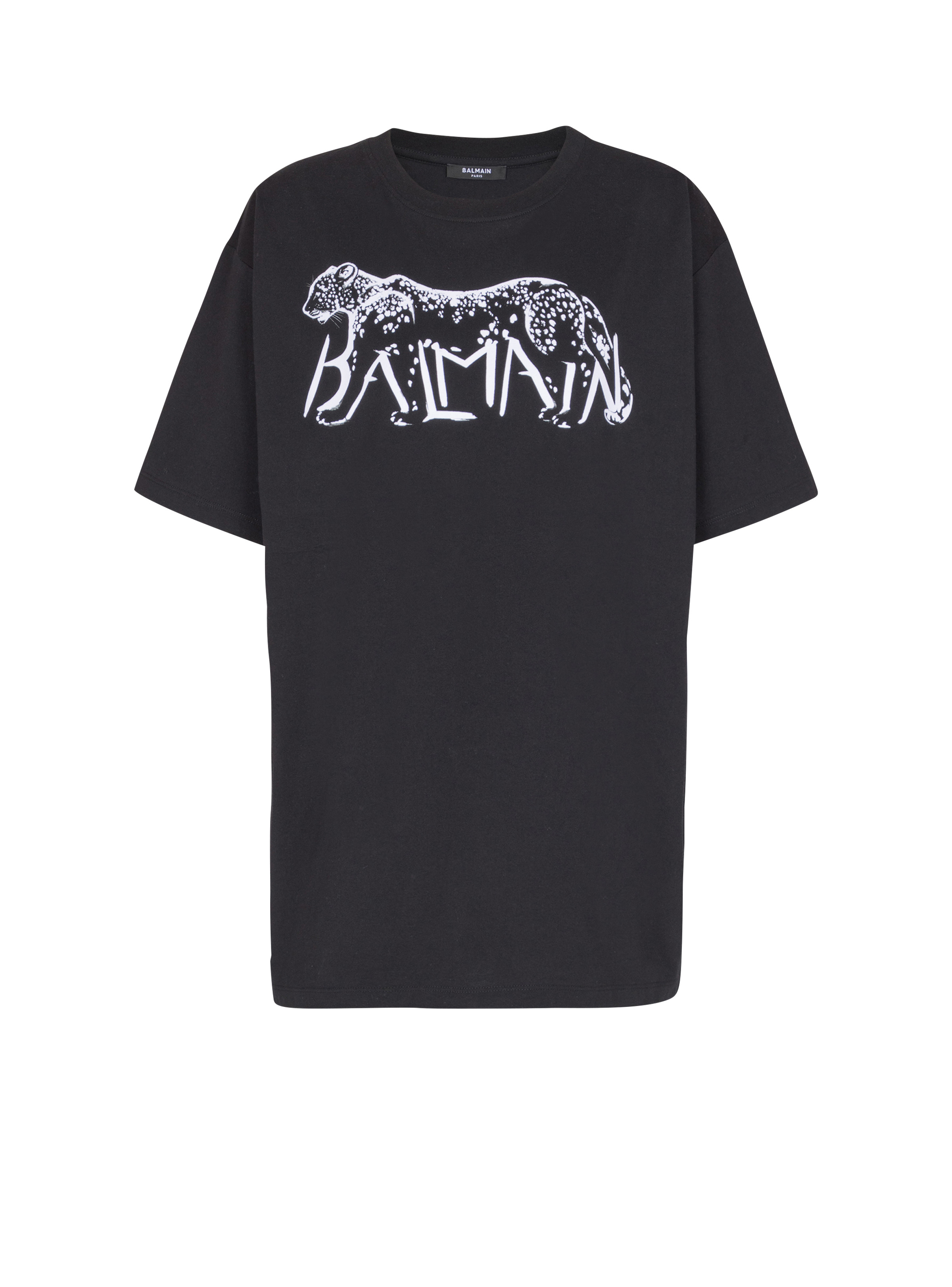 Oversized cotton T-shirt - Round neckline - Short sleeves - Leopard print with Balmain lettering - Plain back - Relaxed fit - Model measures 178cm and wears a size S - Main material: 100% cotton - Made in Portugal - Item: FF0EH005GF22100% of the cotton fibres used to make this garment are certified and organically farmed