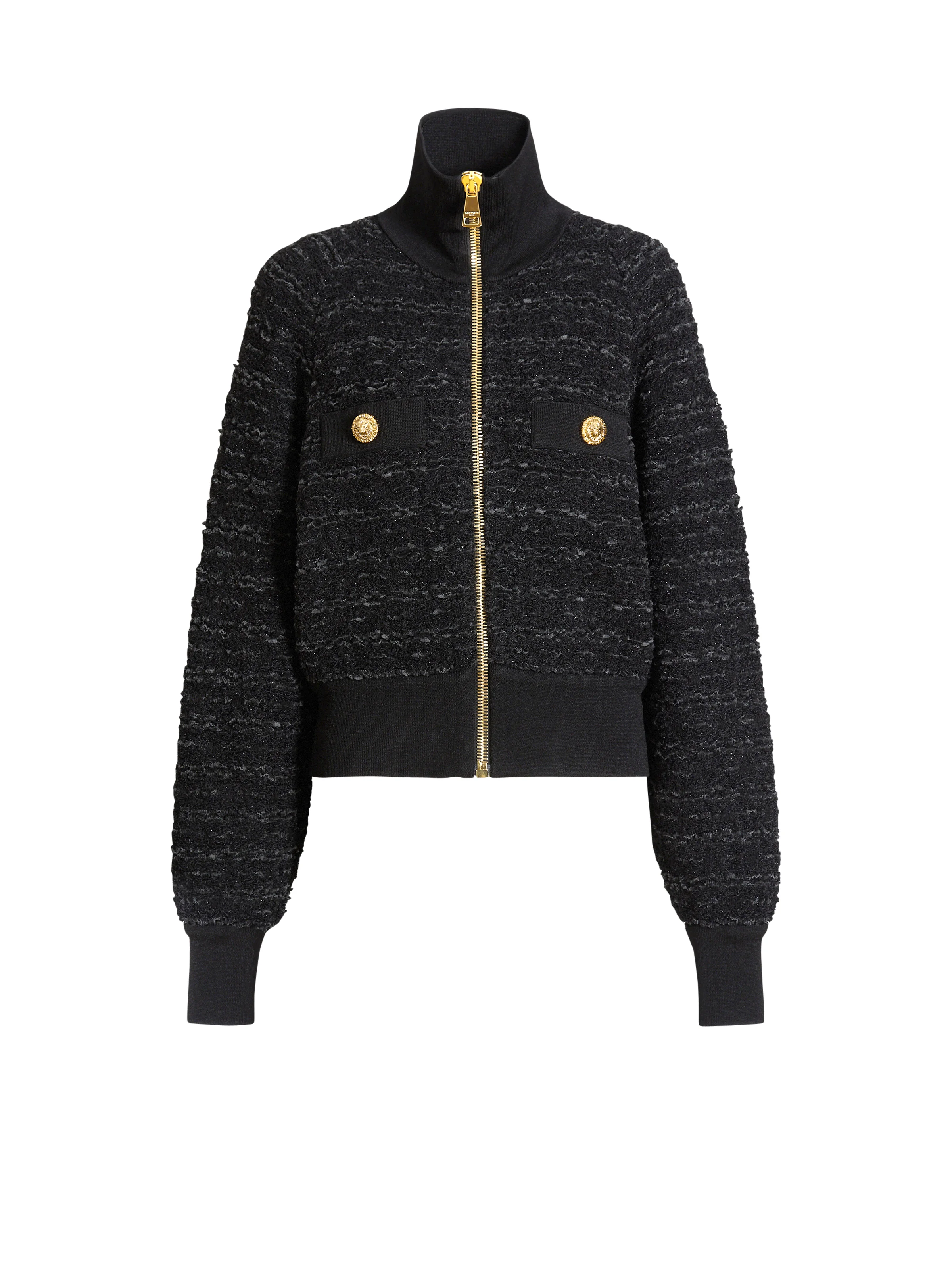 Tweed bomber jacket - High neck - Long batwing sleeves - Decorative side pockets with "Lion Head" buttons - Zip fastening with Balmain Paris-engraved slider - Ribbed edging - Relaxed fit - Model measures 178cm and wears a size 36 - Main material: 55% viscose 13% hemp 10% polyamide 8% wool 8% cotton 6% polyester - Made in France - Item: FF0TE200KJ16100% of the viscose fibres used to make this garment come from certified, sustainably managed forests