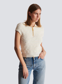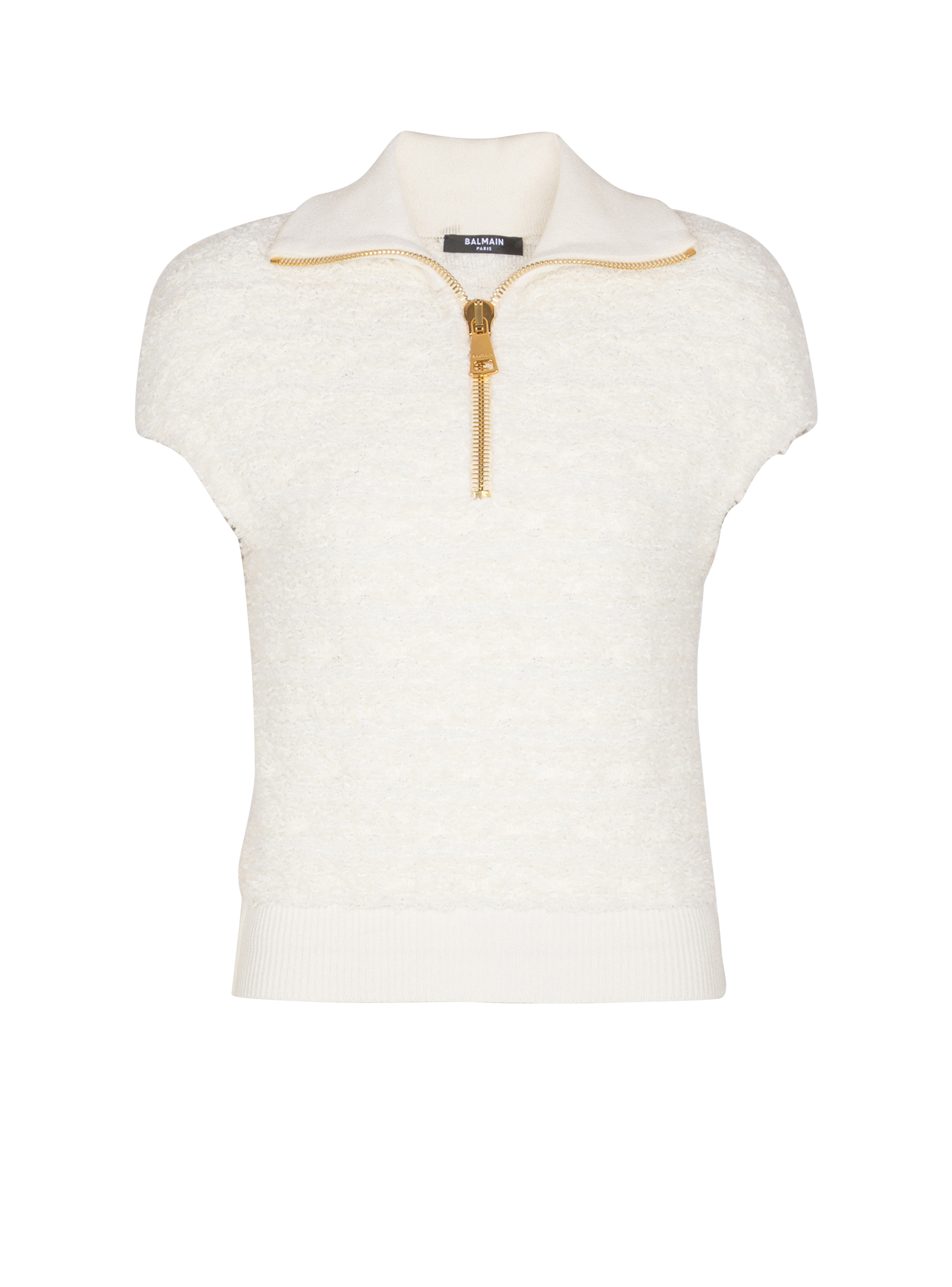 Tweed top - Zip-up collar - Short sleeves - Visible zip with engraved slider - Ribbed edging - Fitted cut - Model measures 180cm and wears a size 36 - Main material: 55% viscose 13% hemp 10% polyamide 8% wool 8% cotton 6% polyester - Made in France - Item: FF0GB025KJ16100% of the viscose fibres used to make this garment come from certified, sustainably managed forests