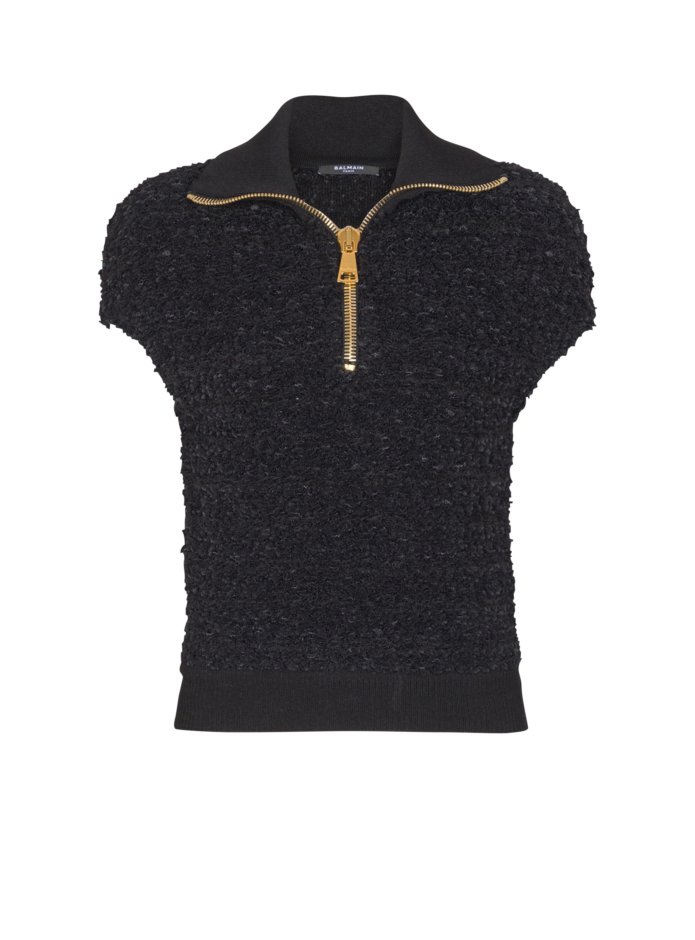 Tweed top - Zip-up collar - Short sleeves - Visible zip with engraved slider - Ribbed edging - Fitted cut - Model measures 180cm and wears a size 36 - Main material: 55% viscose 13% hemp 10% polyamide 8% wool 8% cotton 6% polyester - Made in France - Item: FF0GB025KJ16100% of the viscose fibres used to make this garment come from certified, sustainably managed forests