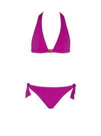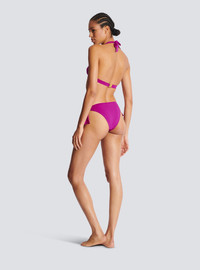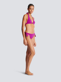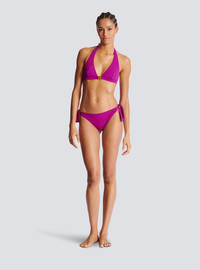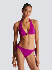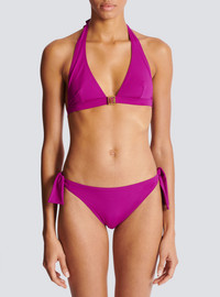 Two-piece PB logo swimsuit - Triangle top - Gold metal PB logo - Neck fastening with 2 tie straps - Gold metal hook fastening at the back - High-cut bottoms with side ties - Model measures 179cm and wears a size 36 - Main material: 84% polyamide 16% elastane - Made in Italy - Item: BKB952210