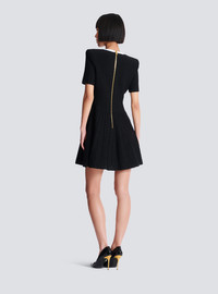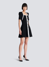 Two-tone ribbed knit dress - Square neckline - Structured shoulders - Short sleeves - 5 decorative two-tone buttons in metal - Skater skirt - Visible gold metal zip fastening on the back with Balmain Paris-engraved slider - Short cut with fitted waist and A-line skirt - Model measures 179cm and wears a size 36 - Main material: 88% viscose 12% polyester - Made in Italy - Item: EF2R7111KF13100% of the viscose fibres used to make this garment are recycled and certified