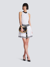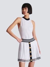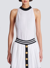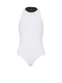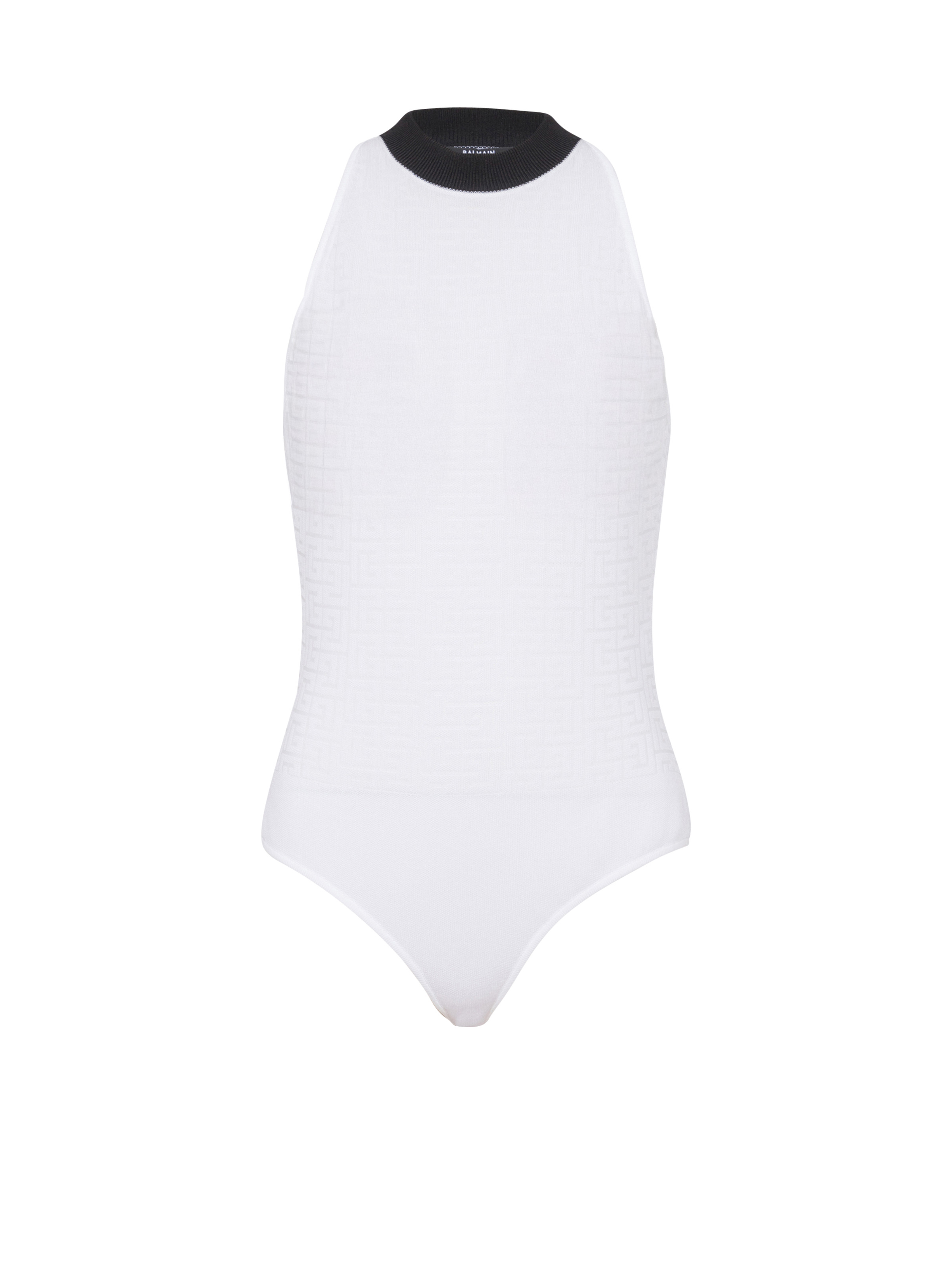 Knit bodysuit with PB Labyrinthe monogram - Halter neckline - 2 buttoned patch pockets on the chest - Decorative "Coin" buttons in gold metal - Contrasting ribbed trim at the neckline and pockets - Tone-on-tone ribbed trim on the armholes and hems - Snap fastening at crotch - Fitted cut - Model measures 179cm and wears a size 36 - Main material: 60% viscose 40% polyamide - Made in France - Item: EF2BA069KI89100% of the viscose fibres used to make this garment come from certified, sustainably managed forests