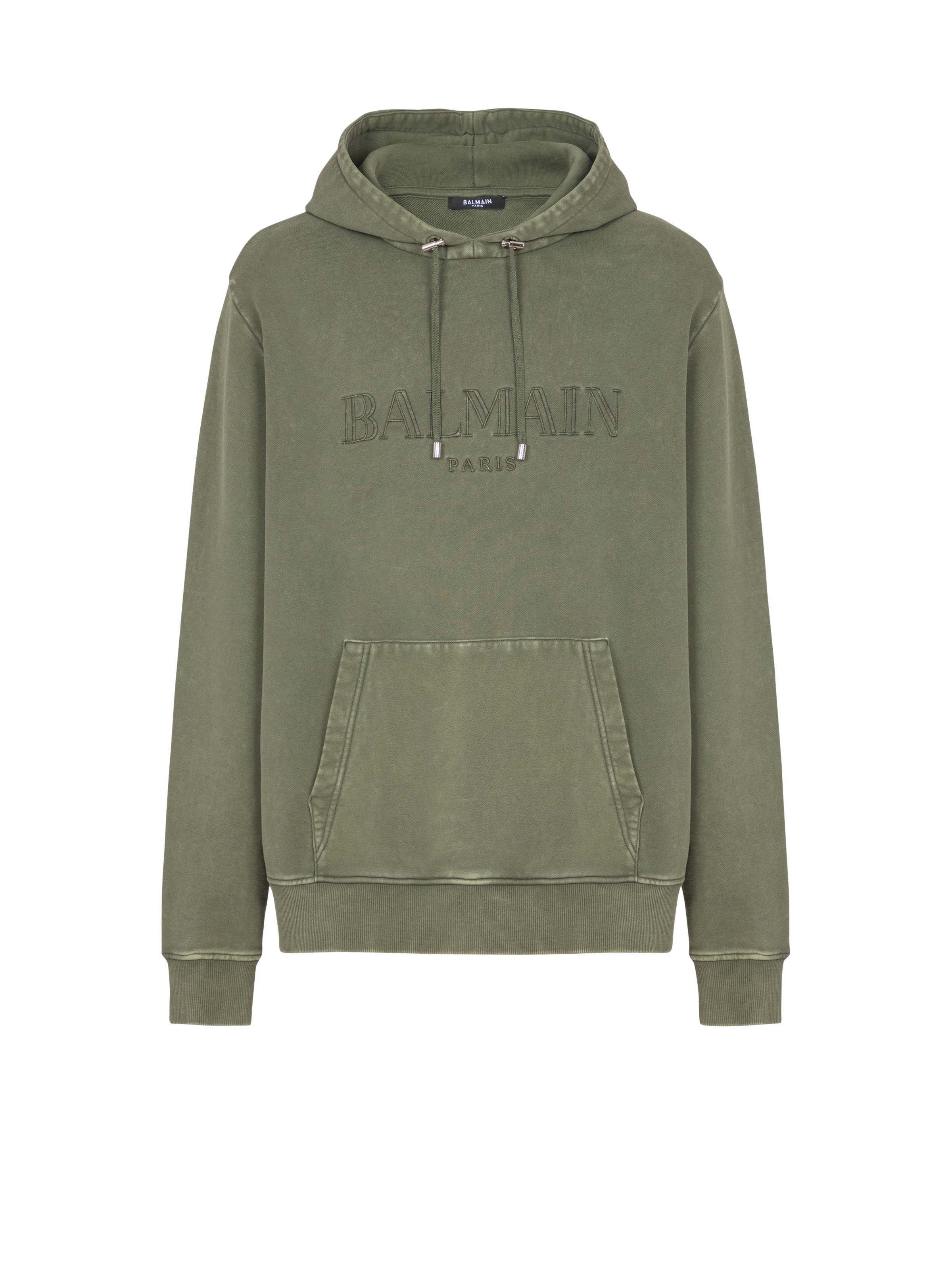 Vintage Balmain embroidered hoodie - Round neckline - Adjustable hood with drawstring - Engraved silver metal aglets and stoppers - Long sleeves - Vintage Balmain logo in tone-on-tone embroidery on the front - Kangaroo pocket - Ribbed trim - Pigment-dyed technique, unique piece - Regular fit - Model measures 190cm and wears a size M - Main material: 100% cotton - Made in Portugal - Item: FH1JT047BC72100% of the cotton fibres used to make this garment are certified and organically farmed