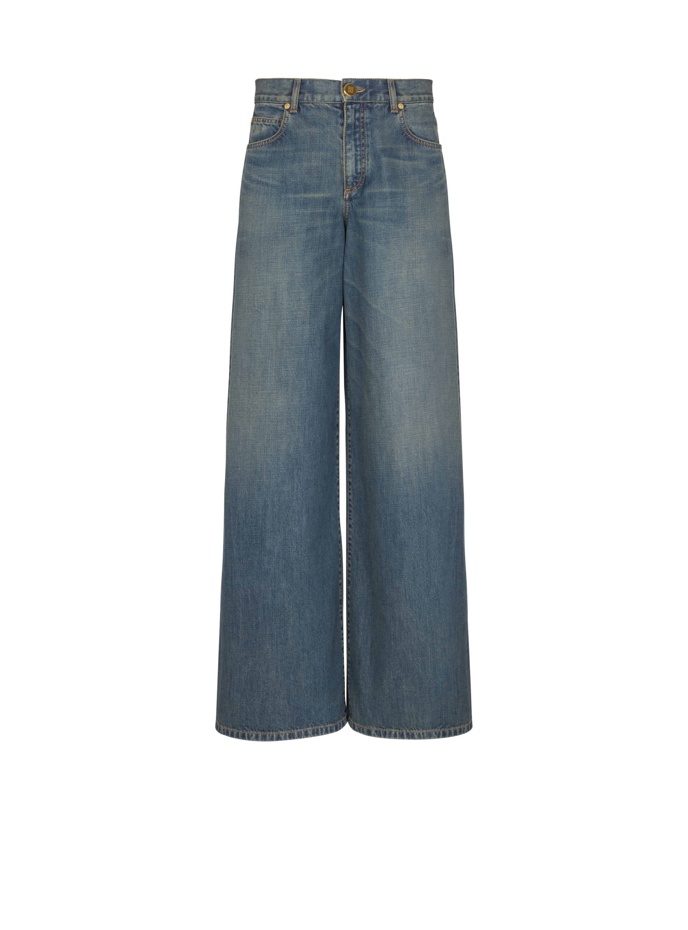 Faded denim jeans - Waistband with multiple belt loops - 5 pockets and rivets - PB-engraved button fastening with zip and fly - Contrasting topstitching and Balmain Paris jacron label on the back - Loose cut - Model measures 190cm and wears a size 30 - Main material: 100% cotton - Made in Romania - Item: FH0ML165DG04