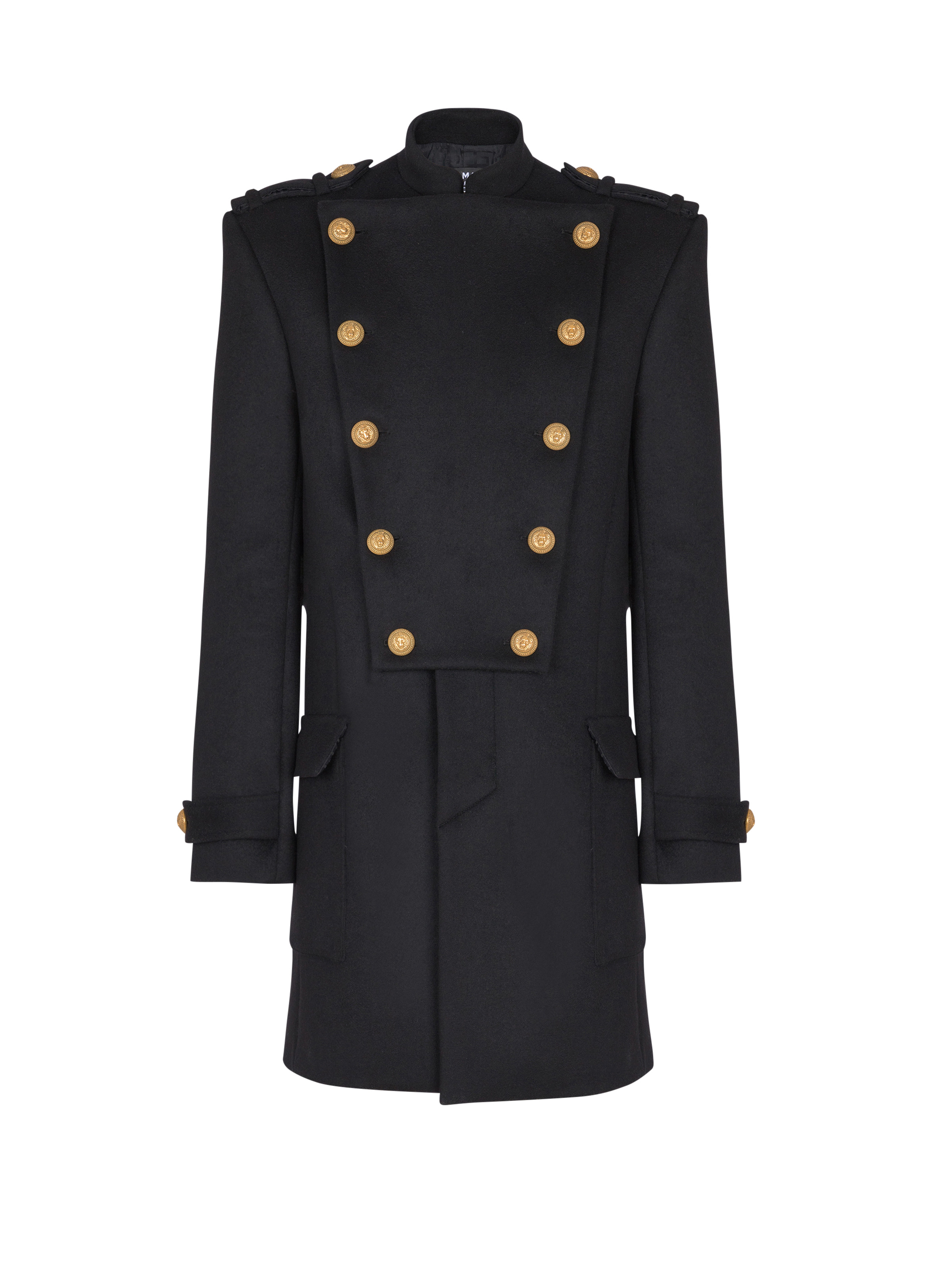 Wool and cashmere coat with detachable bib front - Officer collar - Structured shoulders - Shoulder tabs with buttons and loops - Long sleeves with buttoned tab - Under-placket fastening with 4 engraved buttons - Detachable bib front with 10 buttons - 2 side patch pockets with flaps - Buttoned half-belt on the back - "Chain Lion" buttons in gold metal - Lining with PB Labyrinth monogram - Straight mid-length cut - Model measures 190cm and wears a size 48 - Main material: 90% virgin wool 10% cashmere - Made in Bulgaria - Item: FH1UC155WB50