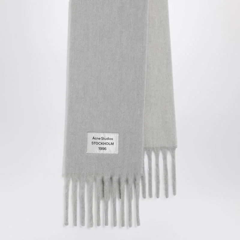 Acne Studios scarf in a wool and alpaca blend, grey on one side and light grey on the other, featuring decorative fringes at the ends and a large patch with logo lettering. Gender: Women Material: 50% Alpaca - 30% Wool - 20% Nylon Color: GREY Made in: Italy Product ID: CA0343DWO/R_ACNE-AO6 *Import tax/duty will be calculated at checkout (If applicable)