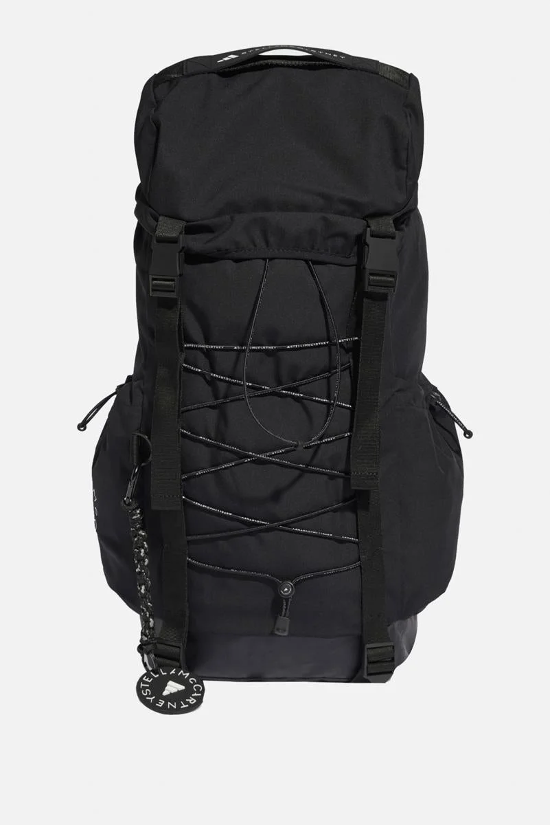 adidas by Stella McCartney backpack made of black recycled nylon with a polyurethane base. It features black-tone hardware, buckle closures on the flap, an internal drawstring closure, a top handle and adjustable shoulder straps. The black nylon-lined interior includes a laptop compartment and a flat pocket. The design is completed with side pockets, an elastic drawstring on the front, a zip pocket on the flap and a logoed keychain. Gender: Women Material: 100% REC POLYESTER Color: Multicolor Made in: Imported Product ID: IN9103 *Import tax/duty will be calculated at checkout (If applicable)