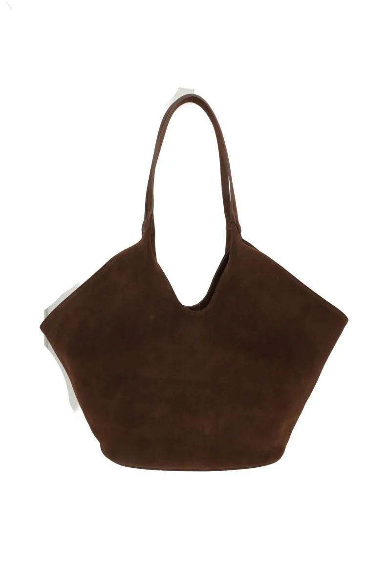 Aesther Ekme tote bag crafted from brown suede. Featuring internal magnetic button closure and double handles. The black twill-lined interior is equipped with a flat pocket. The design is completed with the three-dot logo embossed on the front. Gender: Women Material: 100% CALFSKIN / LINING- 100% POLYESTER Color: COCOA Made in: Spain Product ID: 03COPHT100L22238 *Import tax/duty will be calculated at checkout (If applicable)