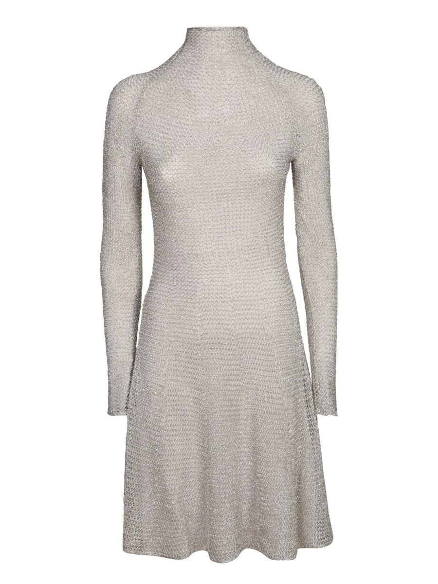 Long-sleeved dress in metallic mesh, high collar, shiny silver finish.. This exclusive ALAIA silver metallic mesh dress features a form-fitting silhouette that elegantly accentuates the figure with contemporary grace. Its understated design and high collar add a timeless touch of sophistication Gender: Women Color: GREY Made in: Imported Product ID: AA9R2615 K051A 210 *Import tax/duty will be calculated at checkout (If applicable)