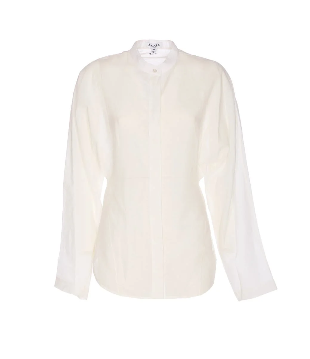 Alaia White Curved Shirt With Frontal Buttons Closure, Long Sleeves, Transaprent Effect, EU SIZE (FR) Gender: Women Material: 76% COTTON, 24%LINEN Color: WHITE Made in: Italy Product ID: AA9C0988W069B000 *Import tax/duty will be calculated at checkout (If applicable)