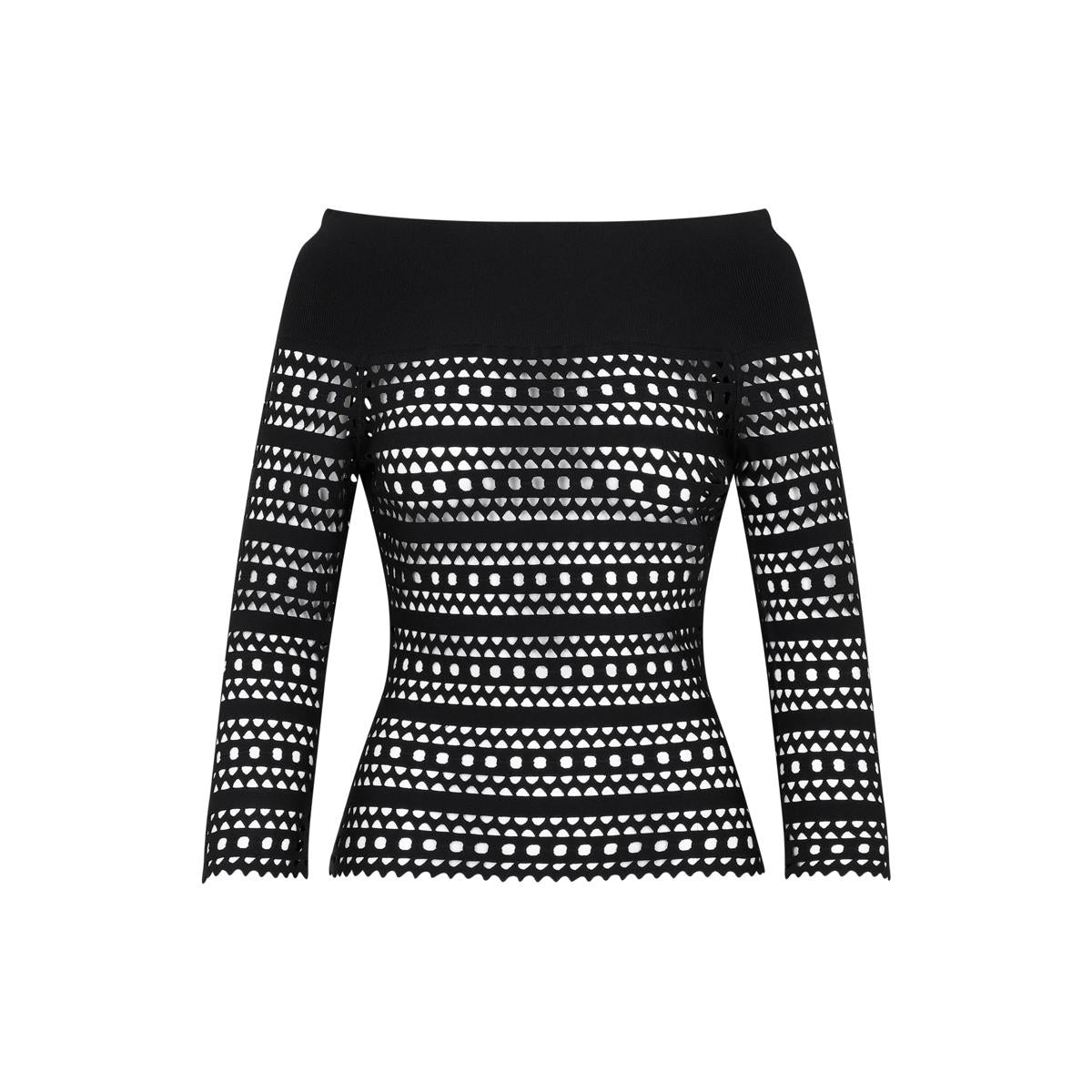 Alaia Black Vienne Top. Crafted in a black blend of viscose and tech fabric with a laser-cut signature Vienne pattern. Ribbed Bardot neckline, long sleeves, see-through, scalloped hem. Gender: Women Material: 75%VISCOSE 25%POLYESTER Color: Black Made in: IT Product ID: AA9H10633M774_995 *Import tax/duty will be calculated at checkout (If applicable)